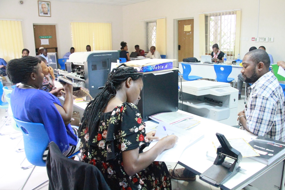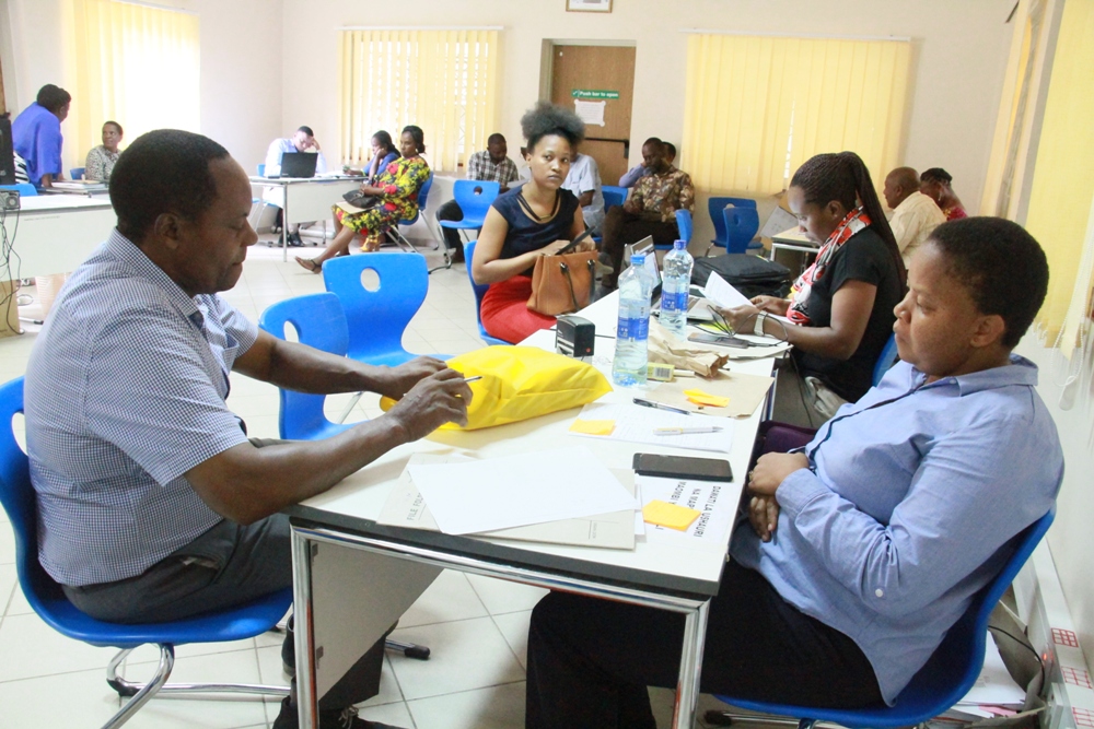 Wanasheria kutoka Ofisi ya Msajili wa NGOs January Kitunsi (kushoto) na Denis Bashaka (wa pili kushoto) wakifafanua jambo kwa wadau wakati wakitoa huduma ya kusajili Taasisi chini ya Sheria ya Mashirika Yasiyo ya Kiserikali Na. 24 ya mwaka 2002 kama ilivyofanyiwa marekebisho na Sheria Na. 3/2019 kutoka Taasisi na Mashirika Yasiyo ya Kiserikali ambayo awali yalisajiliwa chini ya Sheria nyingine katika zoezi linaloendelea kufanyika kwenye Ofisi ndogo za Wizara jijini Dar es Salaam kwa Kanda ya Mashariki.
