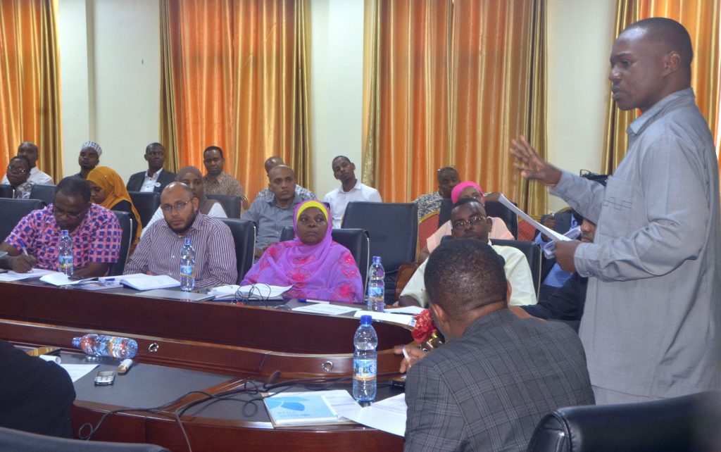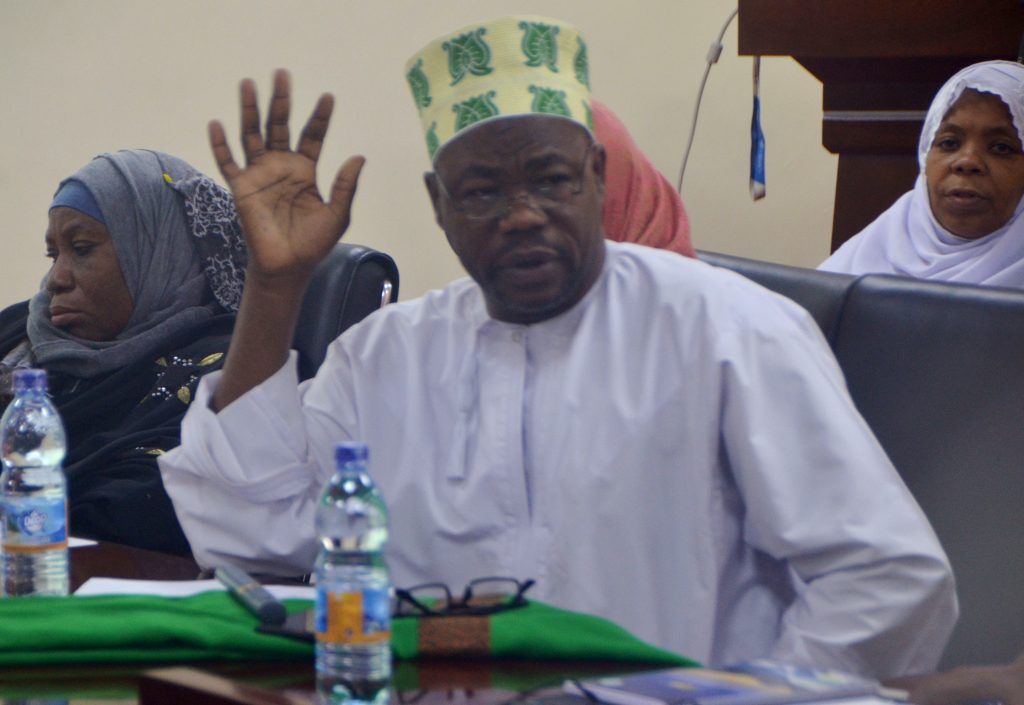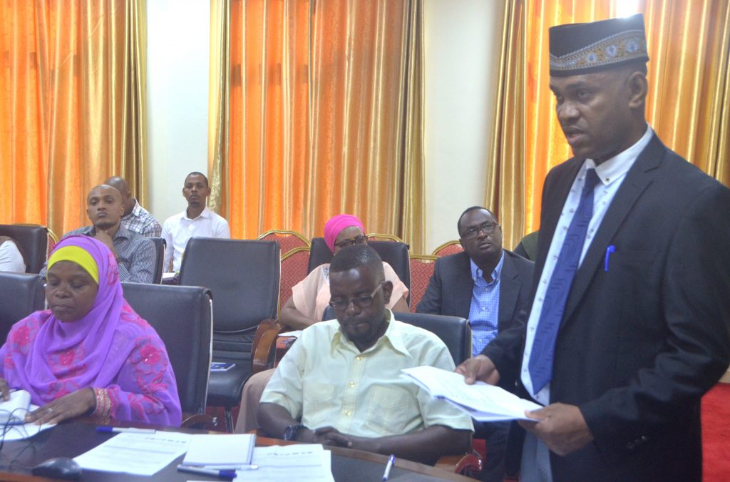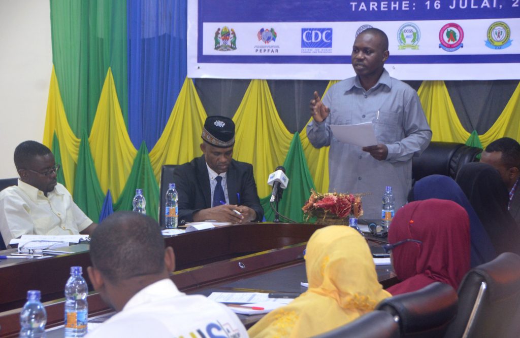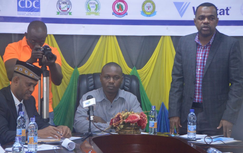 Kamishna kutoka Tume ya Ukimwi Zanzibar Sheikh Mziwanda Ngwali Ahmed akiuliza maswali katika ufunguzi wa mkutano wa Uwasilishaji wa Ripoti ya Utafiti wa Viashiria na Matokeo ya Ukimwi Tanzania wa Mwaka 2016-17 uliofanyika katika Ukumbi wa Ofisi ya Mtakwimu Mkuu Mazizini Zanzibar.