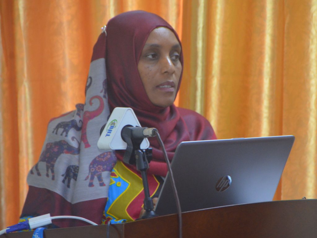 Muasilishaji mada kutoka Ofisi ya Mtakwimu Mkuu wa Serikali Fahima Mohamed Issa akiwasilisha mada kuhusu Utangulizi na Mbinu za Utafiti katika ufunguzi wa mkutano wa Uwasilishaji wa Ripoti ya Utafiti wa Viashiria na Matokeo ya Ukimwi Tanzania wa Mwaka 2016-17 uliofanyika katika Ukumbi wa Ofisi ya Mtakwimu Mkuu Mazizini Zanzibar.