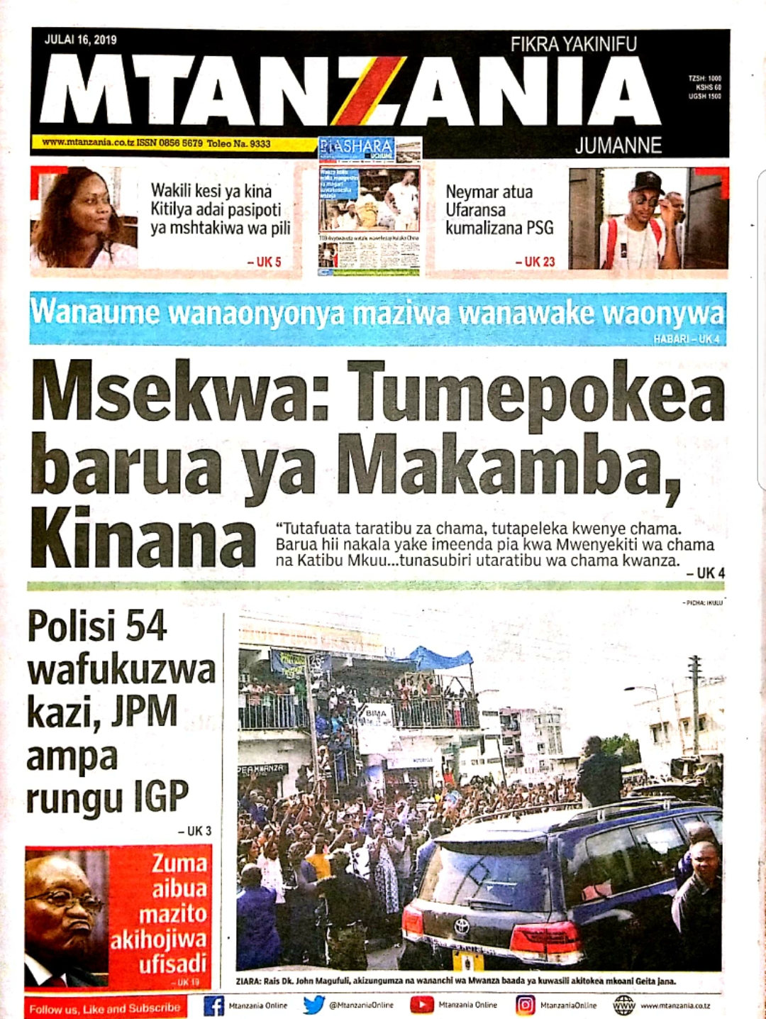 MagazetiPITIA VICHWA VYA HABARI KATIKA MAGAZETI YA LEO JUMANNE JULAI 16,2019 Last updated: 2019/07/16 at 2:43 AM Alex Sonna 6 years ago Share SHARE Alex Sonna July 16, 2019 July 16, 2019 Share this Article Facebook Twitter Email Print Previous Article WATANZANIA WATAKIWA KUCHAGUA VIONGOZI WA MITAA WANAOWEZA KUPAMBANA NA MIMBA ZA UTOTONI. Next Article RAIS MAGUFULI AMWAGIZA WAZIRI UMMY KUFUATILIA MALIPO YOTE YA SERIKALI KWA WAGONJWA WA NJE YA NCHI
