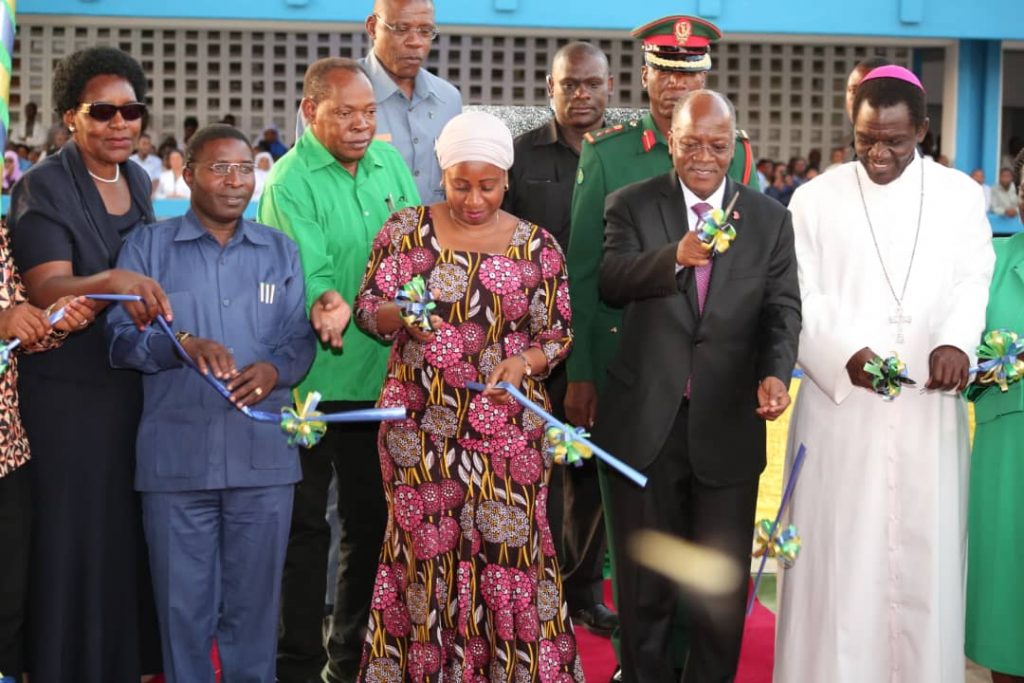 Rais wa Jamhuri ya Muungano wa Tanzania Mhe. Dkt. John Pombe Magufuli akikata utepe kuonesha ishara ya uzinduzi rasmi wa miradi 7 yenye jumla ya shilingi Bilion 15 katika Hospitali ya Rufaa ya kanda ya ziwa Bugando. Kulia kwake ni Baba Askofu Mhashamu Askofu Renatus Nkwande huku kushoto kwake ni Waziri wa Afya Mhe Ummy Mwalimu akifuatiwa na Waziri wa Nishati Medard Kalemani na mwisho ni Naibu Waziri wa Ardhi Mhe. Angelina Mabula