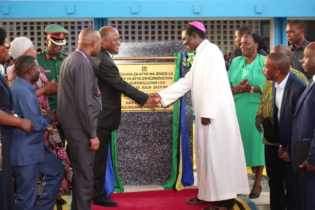 Rais wa Jamhuri ya Muungano wa Tanzania Mhe. Dkt. John Pombe Magufuli akimpa mkono Baba Askofu Mhashamu Askofu Renatus Nkwande baada ya kuzindua mradi wa NHIF ikiwa ni moja kati ya miradi 7 iliyozinduliwa yenye jumla ya shilingi Bilion 15 katika Hospitali ya Rufaa ya kanda ya ziwa Bugando.