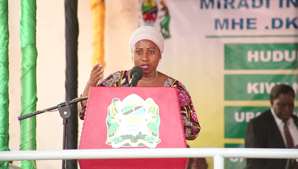 Waziri wa Afya, Maendeleo ya Jamii, Jinsia, Wazee na Watoto Mhe. Ummy Mwalimu akitoa taarifa ya Wizara ya utekelezaji mbele ya Rais wa Jamhuri ya Muungano wa Tanzania Mhe. Dkt. John Pombe Magufuli (hayupo kwenye picha) wakati wa uzinduzi rasmi wa miradi 7 yenye jumla ya shilingi Bilion 15 katika Hospitali ya Rufaa ya kanda ya ziwa Bugando.
