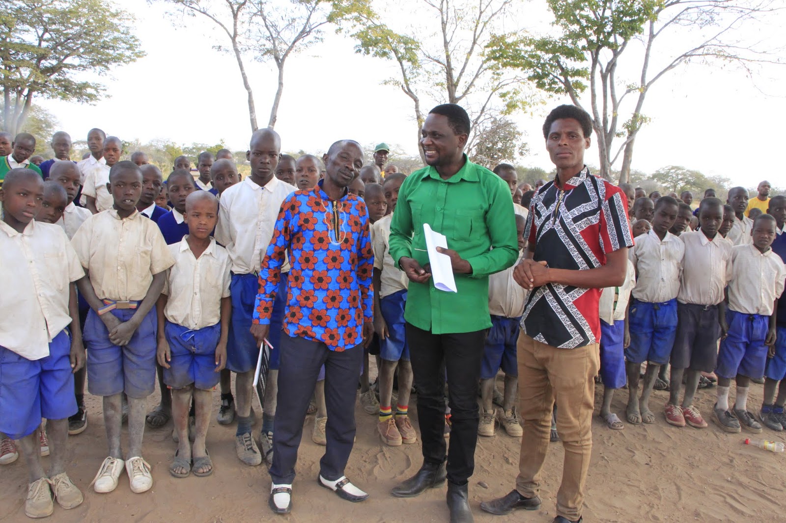 Mbunge wa Jimbo la Singida Magharibi, Eribariki Kingu, akiwa na Walimu wawili pekee wa kujitolea wa Shule ya Msingi ya Ishingisha aliowaahidi kuwapa sh.milioni 1.5 kutoka katika mfuko wa jimbo kama motisha. Kushoto ni Mwalimu Daniel Michael na Mwalimu Augustinho Kitiku.