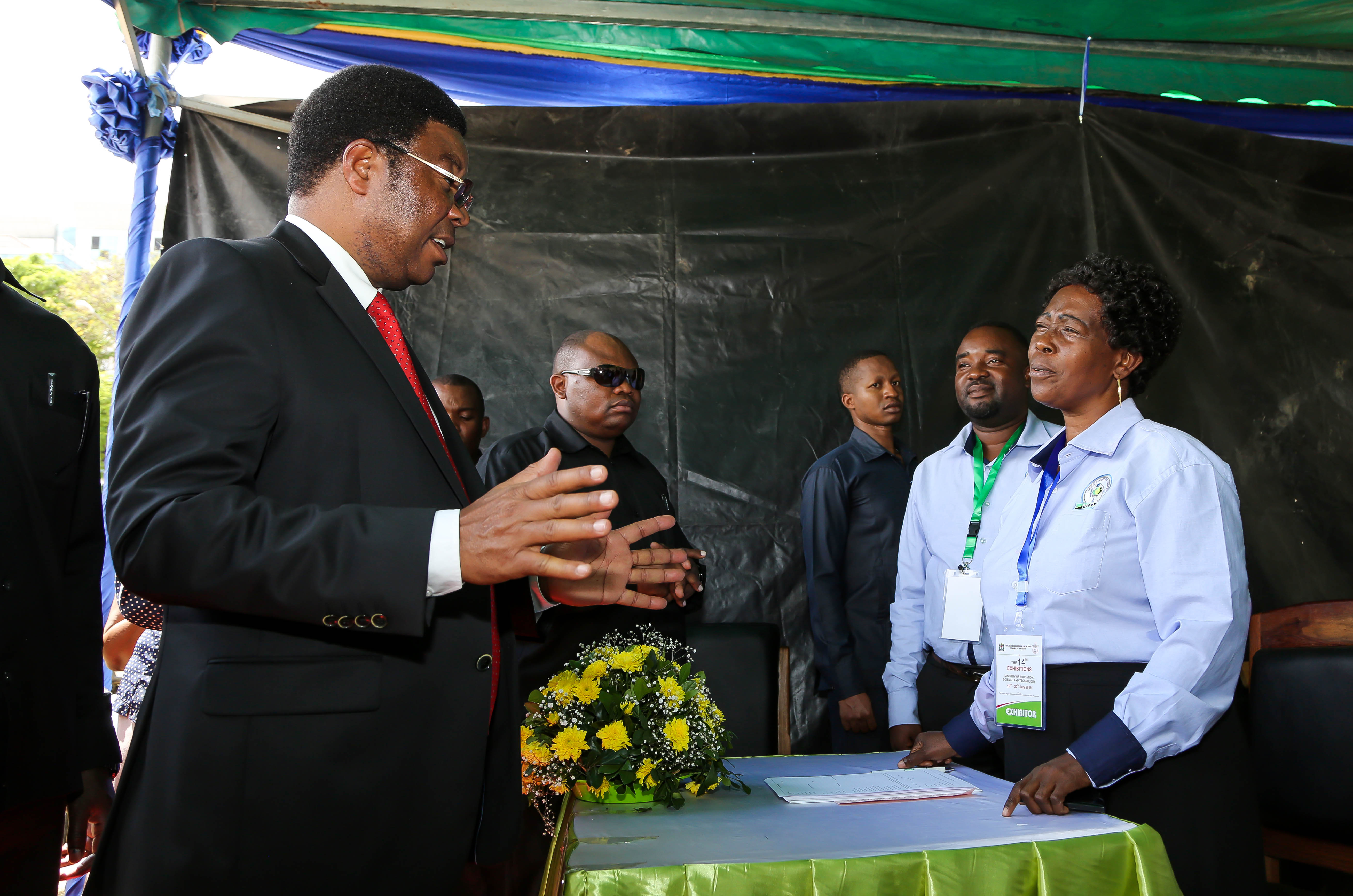 Waziri Mkuu Kassim Majaliwa, akiangalia mita ya maji ya malipo ya kabla, iliyobuniwa na mwanafunzi wa Chuo Kikuu cha Saint Joseph, Khadija Mustapha (kulia), kabla ya kufungua Maonesho ya 14 ya Elimu ya Juu, Sayansi na Teknolojia, yaliyofanyika katika viwanja vya Mnazi Mmoja, jijini Dar es salaam, Julai 17.2019. (Picha na Ofisi ya Waziri Mkuu).