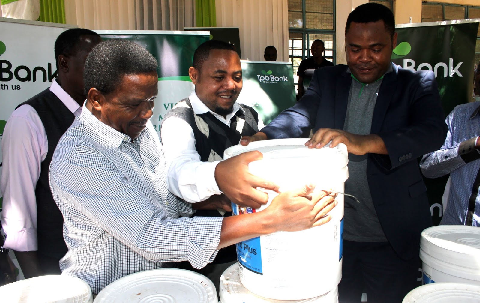 Mkurugenzi wa masoko kutoka benki ya TPB Deogratius Kwiyuka katikati akikabidhi ndoo za rangi 50 katika shule ya Sekondari Buluba kama sehemu ya faida kwenye benk hiyo, wa kwanza kulia ni mwanafunzi Thomas Majuto,na mwisho kushoto ni meneja wa (SHIRECU) Ramadhani Kato, akifuatiwa na mwenyekiti wa SHIRECU Richard Luhende.