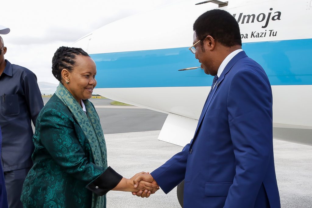 Waziri Mkuu Kassim Majaliwa, akisalimiana na Mkuu wa Mkoa wa Kilimanjaro, Anna Mghwira, wakati akiwasili katika uwanja wa KIA, kwa ziara ya kikazi ya siku nne mkoani Kilimanjaro, Julai 18.2019. (Picha na Ofisi ya Waziri Mkuu).