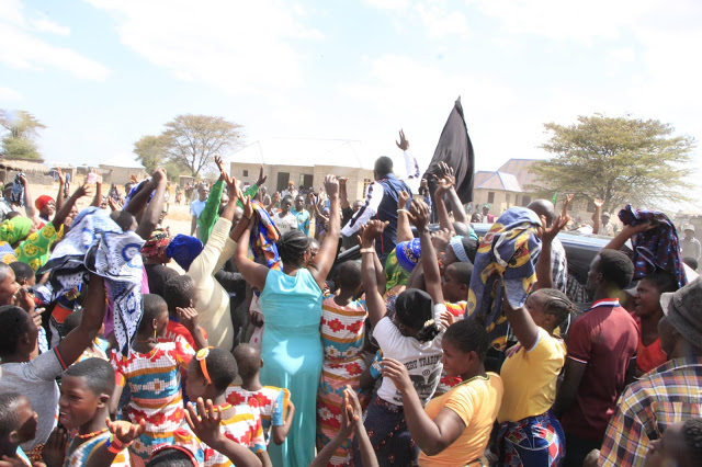 Wananchi wa Kitongoji cha Kaugeri Kata ya Mwaru katika Halmashauri ya Wilaya ya Ikungi mkoani Singida wakimlaki Mbunge wao Elibariki Kingu baada ya kuwasili kwa ajili ya kufanya mikutano ya hadhara kwenye kata hiyo jana.
