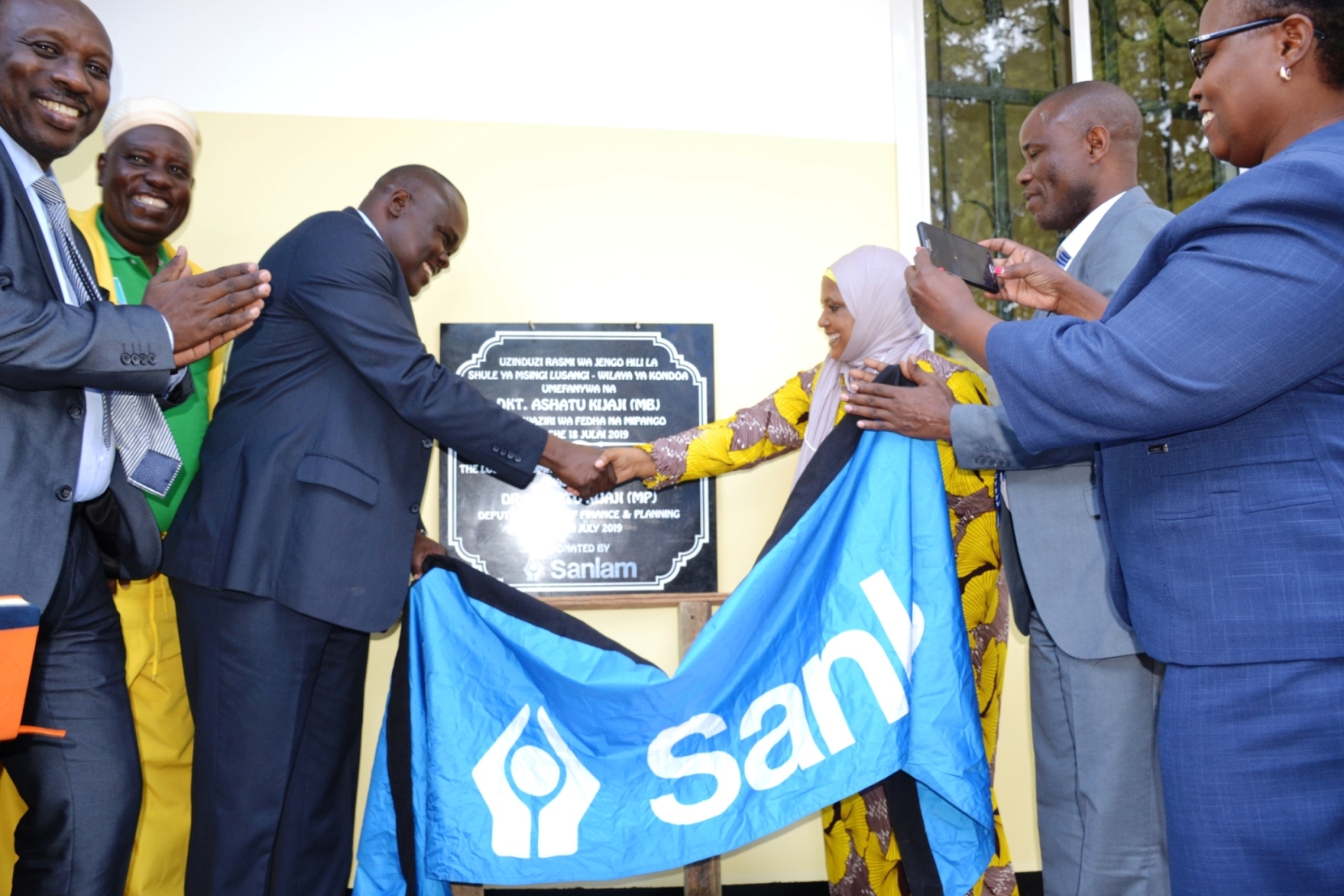 Naibu Waziri wa Fedha na Mipango, Dk. Ashatu Kijaji (katikati) na Mkurugenzi Mtendaji wa Kampuni ya bima Sanlam kanda ya Afrika Mashariki, Julius Magabe wakishikana mikono baada ya kufungua pazia la jiwe la msingi katika uzinduzi wa madarasa mawili na ofisi ya walimu ya Shule ya Msingi Lusangi yaliyojengwa kwa msaada wa Kampuni ya Bima ya Sanlam kwa thamani ya shilingi Milioni 49. Uzinduzi huo ulifanyika shuleni hapo tarafa ya Pahi, Wilaya ya Kondoa, Mkoani Dodoma mwishoni mwa wiki. Kushoto ni Ofisa Mtendaji Mkuu wa Kampuni ya Bima ya Sanlam Life, Khamis Suleiman , Kamishna wa Mamlaka ya Usimamizi wa Bima (TIRA), Dk. Mussa Juma (wa pili kulia) na Meneja wa Mamlaka hiyo kanda ya kati, Stella Rutaguza (kulia).