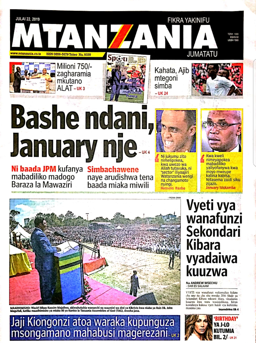 MagazetiPITIA VICHWA VYA HABARI KATIKA MAGAZETI YA LEO JUMATATU JULAI 22,2019 Last updated: 2019/07/22 at 3:14 AM Alex Sonna 6 years ago Share SHARE Alex Sonna July 22, 2019 July 22, 2019 Share this Article Facebook Twitter Email Print Previous Article Sanlam yakabidhi madarasa na ofisi za walimu Kondoa Next Article WANANCHI MKIOMBWA RUSHWA YA NGONO TOENI TAARIFA-TAKUKURU
