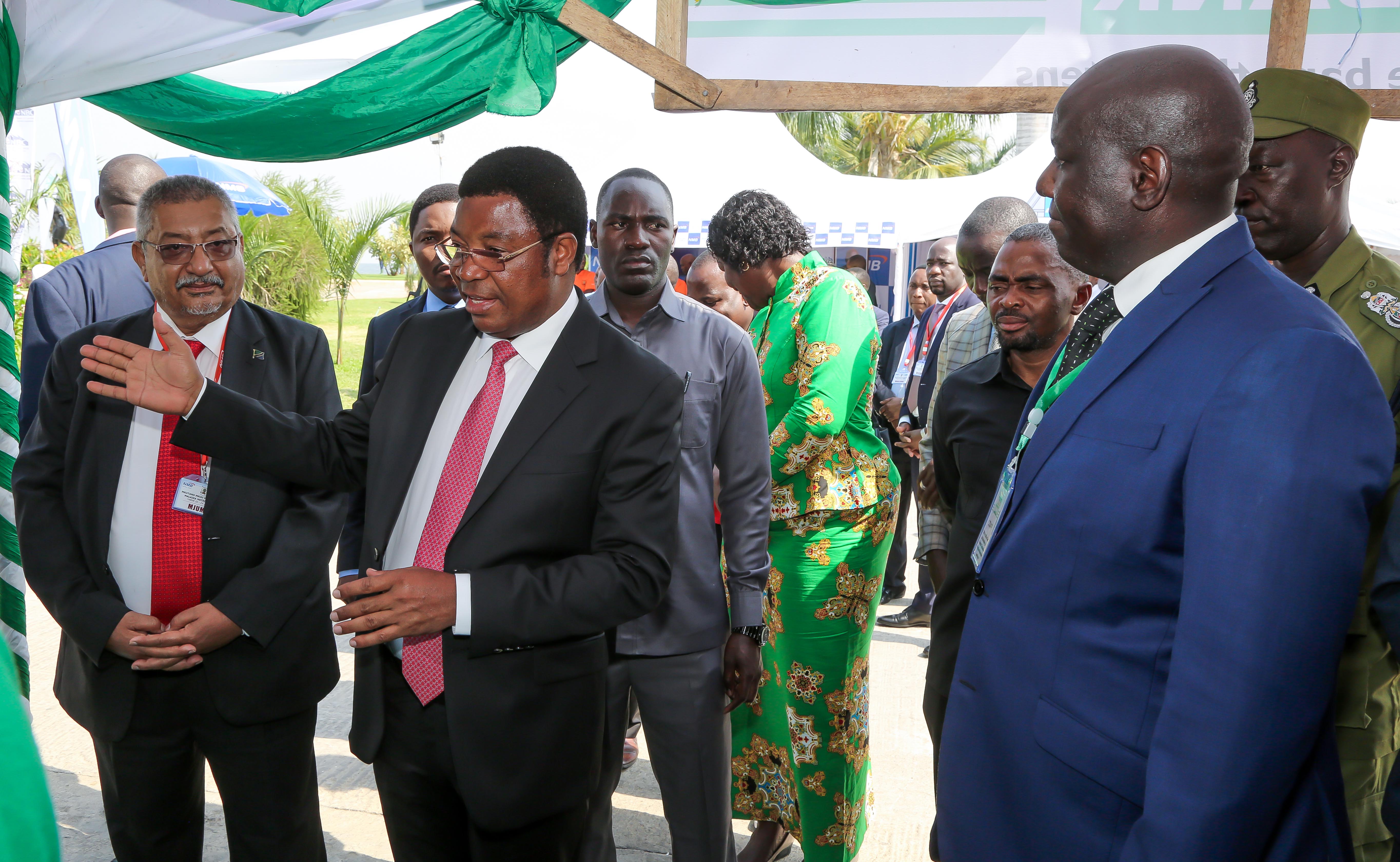 Waziri Mkuu Kassim Majaliwa, akimsikiliza Meneja wa Mahusiano ya Serikali Benki ya NBC, William Kallaghe, wakati akikagua mabanda, katika mkutano mkuu wa 35 wa Jumuiya ya Tawala za Mitaa Tanzania (ALAT), uliyofanyika katika ukumbi wa Malaika, jijini Mwanza, alipomwakimwakilisha Rais Magufuli katika mkutano huo, Julai 23.2019. (Picha na Ofisi ya Waziri Mkuu).