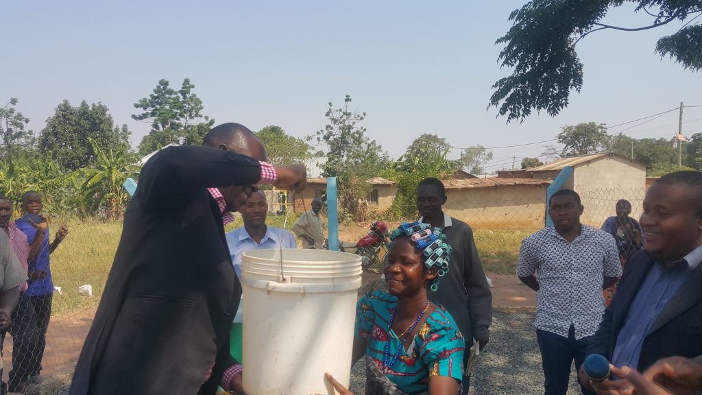 Naibu Waziri wa Maji, Mhe. Jumaa Aweso (Mb) akimtua mama ndoo katika Kijiji cha Chigunga, miongoni mwa vijiji vitano vinavyonufaika na Mradi wa Maji wa Chankorongo katika Halmashauri ya Wilaya ya Geita, mkoani Geita.