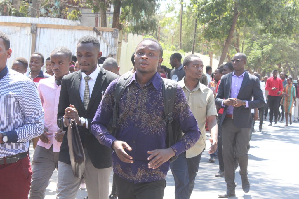 Baadhi ya viongozi wa wanafunzi na wanafunzi wa vyuo mbalimbali wakiandamana kuelekea ofisi ya Mkuu wa Wilaya ya Dodoma, kuwasilisha walaka wao, waliomwandikia Rais wa Jamhuri ya Muungano wa Tanzania Dkt John Magufuli, kumpongeza kwa kazi nzuri anayoifanya.