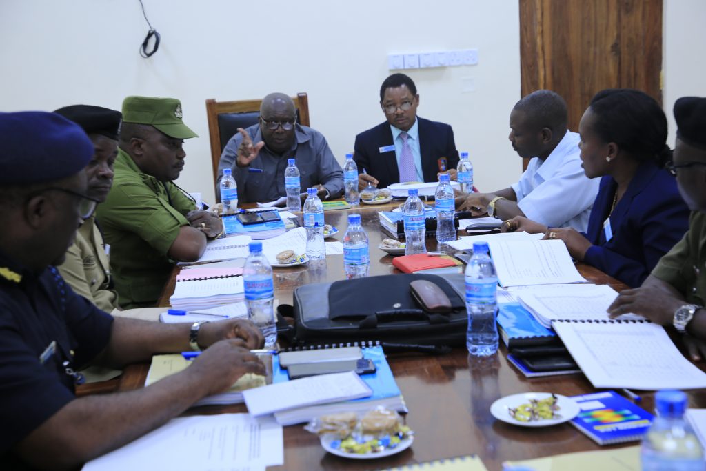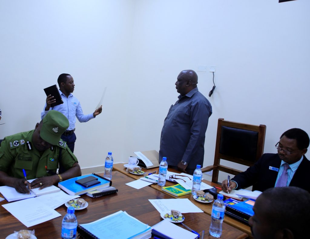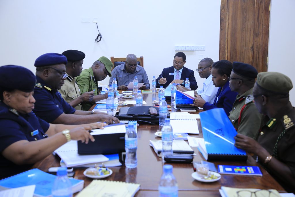 Waziri wa Mambo ya Ndani ya Nchi, Kangi Lugola (kushoto meza kuu) na Katibu Mkuu wa Wizara hiyo, Meja Jenerali Jacob Kingu, wakiongoza kikao cha Wajumbe wa Tume ya Utumishi ya Polisi, Uhamiaji na Magereza katika kikao cha kujadili utendaji wa vyombo vilivyopo chini ya Wizara. Kikao hicho kilifanyika Ukumbi wa Wizara, jijini Dodoma, leo.