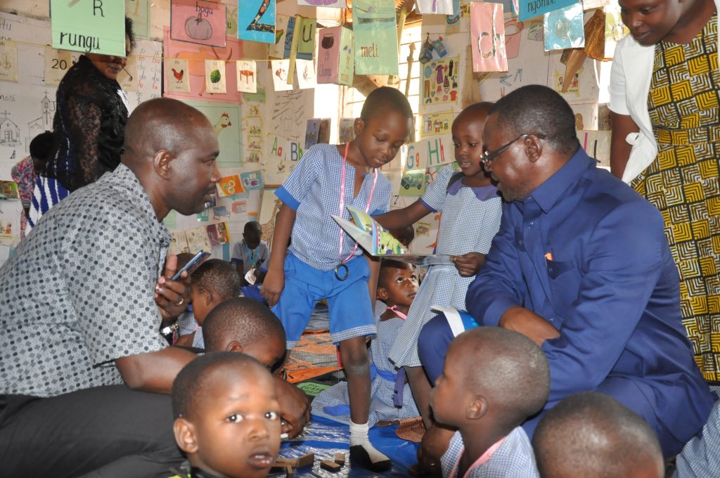Naibu Katibu Mkuu Ofisi ya Rais Tawala za Mikoa na Serikali za Mitaa anayeshughulikia Elimu bwana Tixon Nzunda akimsikiliza kwa makini mwanafunzi wa shule ya awali Elieda Isaack wakati mtoto huyo alipotaka kumsomea Naibu Waziri hadithi kufuatia ziara aliyoifanya kiongozi huyo kleo katika shule ya msingi Bukumbi wilayani Misungwi