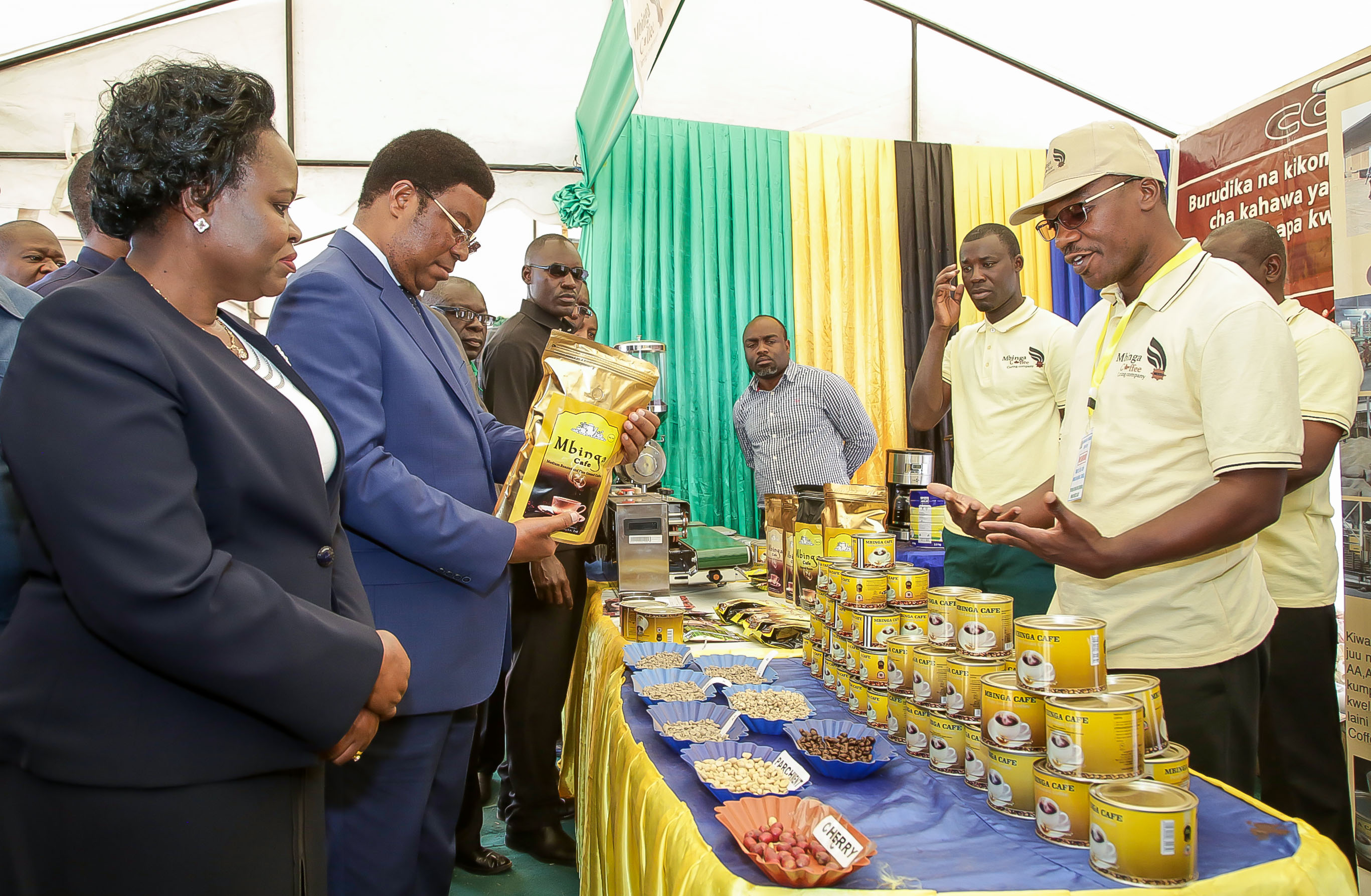 Waziri Mkuu Kassim Majaliwa, akiwa na mwenyeji wake Mkuu wa Mkoa wa Ruvuma Christina Mndeme (kushoto), akizungumza na wafanyakazi wa Kampuni ya Mbinga Coffee Curing Company, kabla ya kufungua maonesho ya viwanda na kongamano la uwekezaji mkoani Ruvuma, Julai 25.2019.