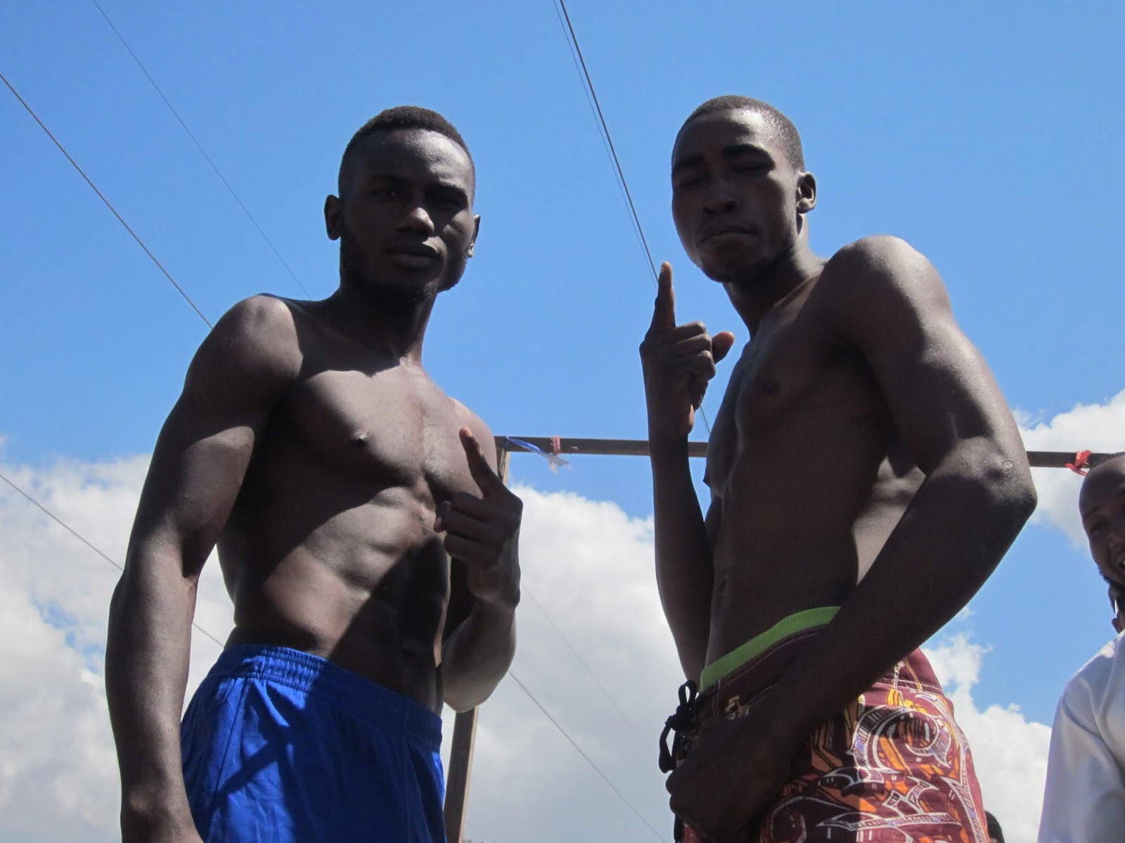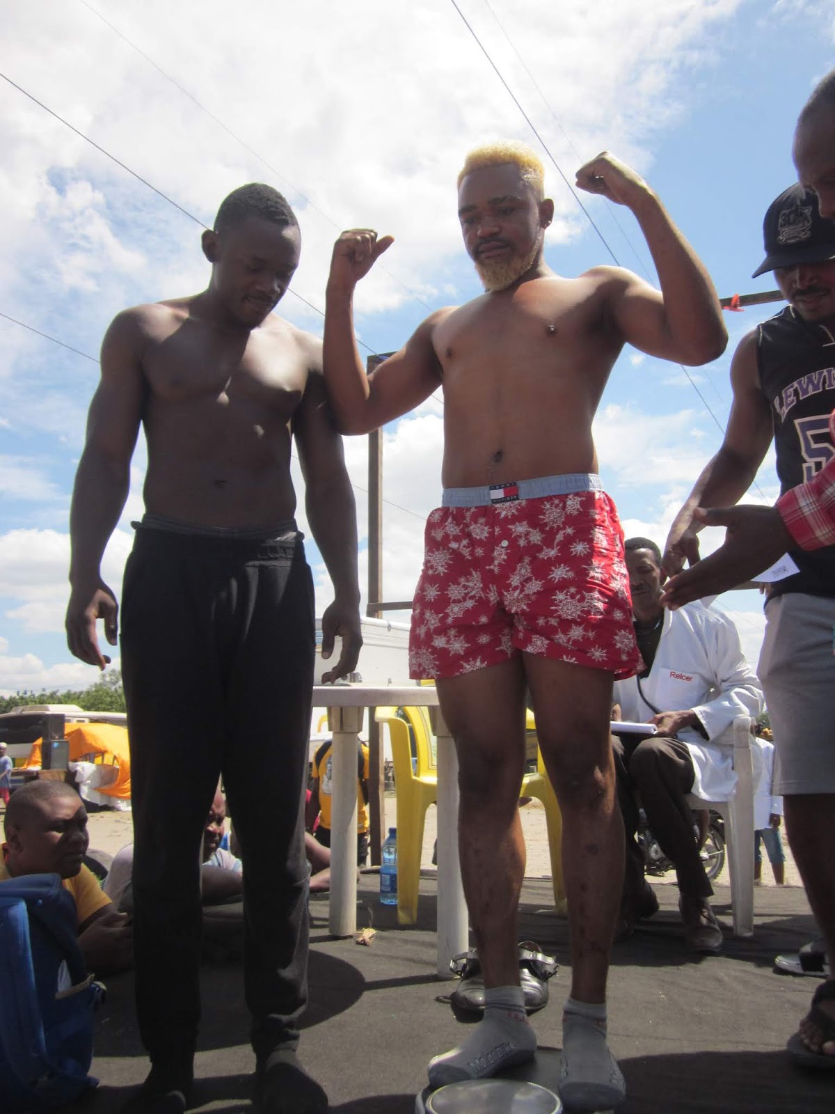 Mabondia Adam Yusufu kushoto akitambiana na Ibrahimu Makubi baada ya kupima uzito na Afya kwa ajili ya mpambano wao utakaofanyika katika fukwe za Escap One Mikocheni |