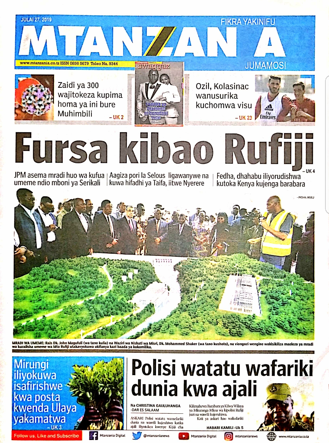 MagazetiPITIA VICHWA VYA HABARI KATIKA MAGAZETI YA LEO JUMAMOSI JULAI 27,2019 Last updated: 2019/07/27 at 4:05 AM Alex Sonna 7 years ago Share SHARE Alex Sonna July 27, 2019 July 27, 2019 Share this Article Facebook Twitter Email Print Previous Article Maafisa Michezo Nchini Watakiwa Kusimamia Michezo na Sio Kukaa Ofisini Next Article RAIS DKT MAGUFULI AREJEA DAR ES SALAAM KWA TRENI YA TAZARA AKITOKEA KWENYE SHEREHE ZA UWEKAJI JIWE LA MSINGI MRADI MKUBWA WA UMEME WA MW 2,115 RUFIJI