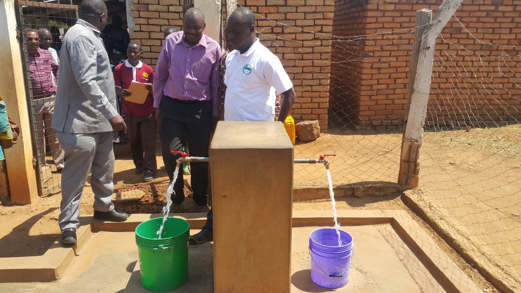 Naibu Waziri wa Maji, Jumaa Aweso akifungua maji mara baada ya kuzindua Mradi wa Maji wa Bulugala katika Halmashauri ya Wilaya ya Mbogwe, mkoani Geita.