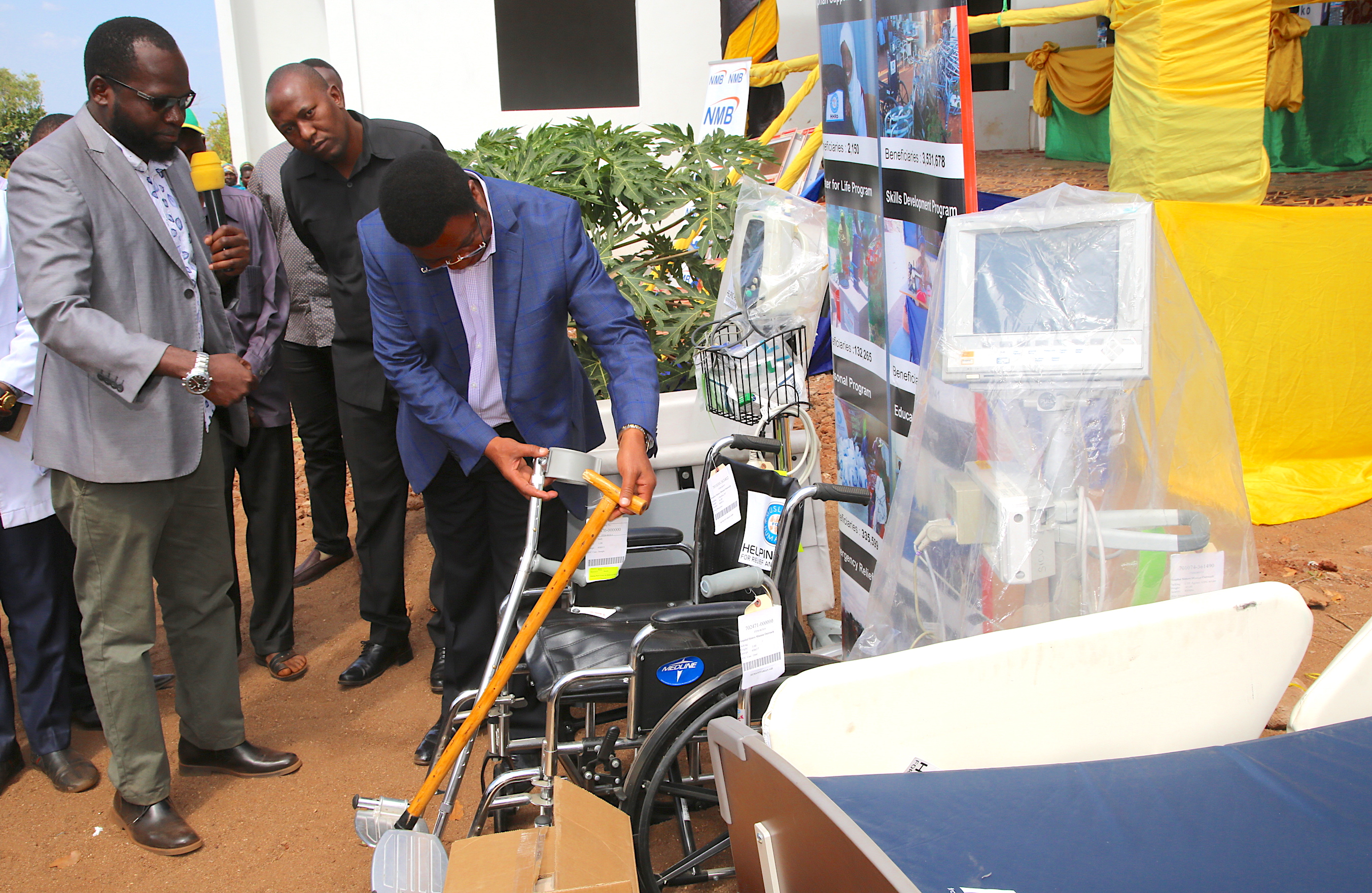 Waziri Mkuu, Kassim Majaliwa akitazama vifaa mbalimbali vya hospitali vilivyotolewa na Taasisi ya Helping Hand na Taasisi ya Jamii Bora kwa ajili ya Hospitali, Zahanati na Vituo vya Afya wilayani Ruangwa, kwenye viwanja vya Zahanati ya Nandagala wilayani humo, Julai 28, 2019. Makabidhiano ya vifaa hivyo yalifanyika kwenye Zahanati ya Nandagala. Wa pili kulia ni Mwenyekiti wa Taasisi ya Jamii Bora, Yassir Salim. (Picha na Ofisi ya Waziri Mkuu)