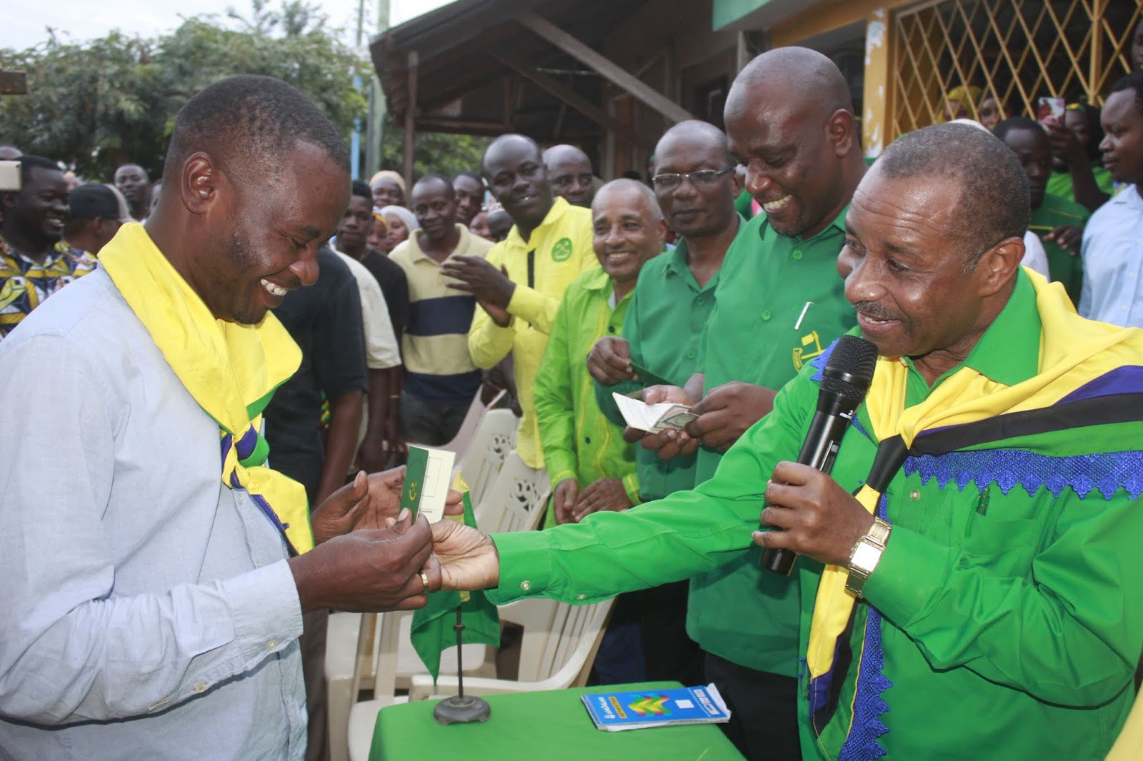 Katibu wa Idara ya Organization ya Kamati Kuu ya Chama cha Mapinduzi Taifa Pereira Silima kulia akipokea kadi ya Chama cha wananchi (CUF) kutoka kwa aliyekuwa Diwani wa Kata ya Pangani Mashariki (CUF) Akida Boramimi baada ya kujiunga na chama hicho kwenye mkutano wa hadhara wa Mbunge wa Jimbo la Pangani (CCM) Jumaa Aweso ambaye pia ni Naibu Waziri wa Maji