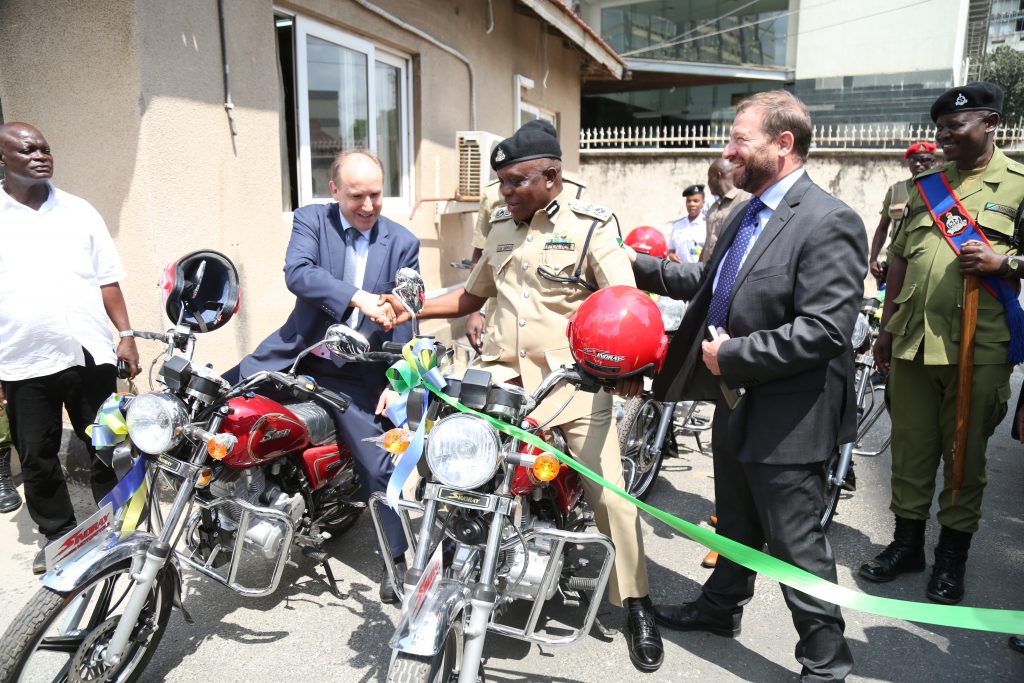 Inspekta Jenerali wa Polisi IGP Simon Sirro akipokea pikipiki miongoni mwa msaada wa magari mawili na pikipiki kumi kutoka kwa maafisa wawakilishi wa Shirika la Upelelezi la Ujerumani (BKA) Bwana Rene Becker (kushoto) na Bwana Harald Gessner. Hafla ya kupokea msaada huo imefanyika leo Makao Makuu ya Jeshi la Polisi Jijini Dar es Salaam.