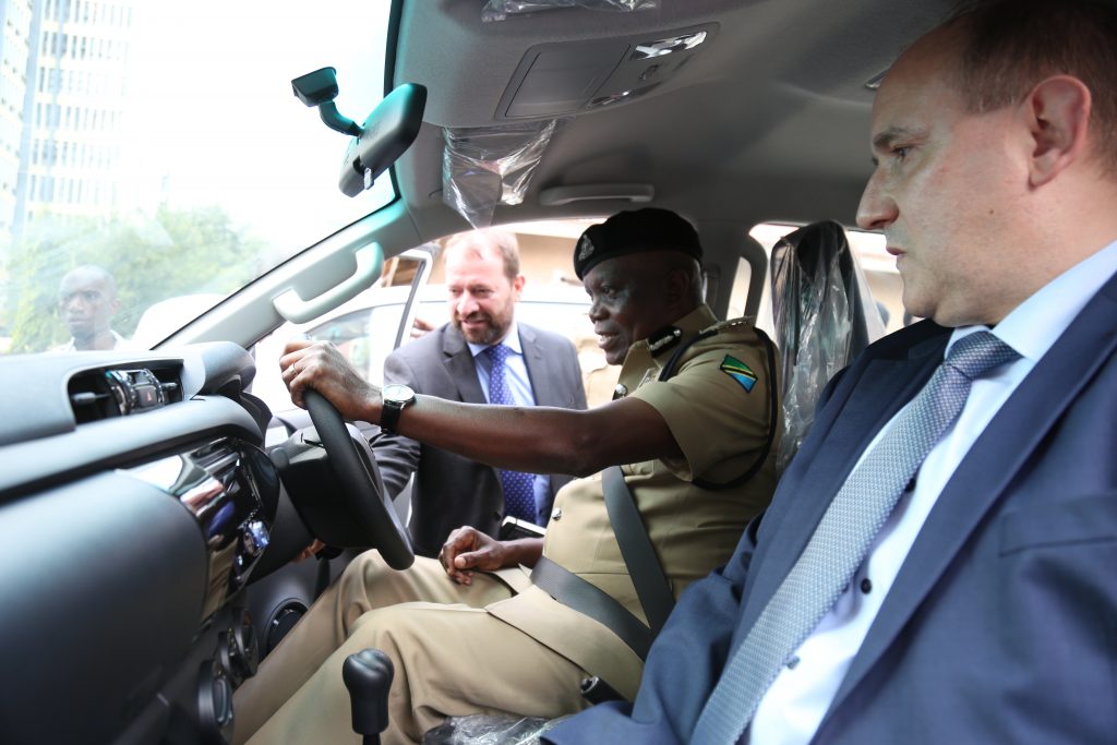 Inspekta Jenerali wa Polisi IGP Simon Sirro akiwasha gari miongoni mwa msaada wa magari mawili na pikipiki kumi kutoka kwa maafisa wawakilishi wa Shirika la Upelelezi la Ujerumani (BKA) Bwana Rene Becker (kulia) na Bwana Harald Gessner. Hafla ya kupokea msaada huo imefanyika leo Makao Makuu ya Jeshi la Polisi Jijini Dar es Salaam.