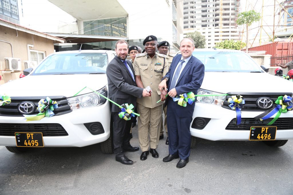 Inspekta Jenerali wa Polisi IGP Simon Sirro akikata utepe pamoja na maafisa wawakilishi wa Shirika la Upelelezi la Ujerumani (BKA) Bwana Rene Becker (kulia) na Bwana Harald Gessner (kushoto) kuashiria makabidhiano ya msaada wa magari mawili na pikipiki kumi kwa Polisi kutoka Shirika la Upelelezi la Ujerumani (BKA). Hafla ya kupokea msaada huo imefanyika leo Makao Makuu ya Jeshi la Polisi Jijini Dar es Salaam. Picha na Jeshi la Polisi.