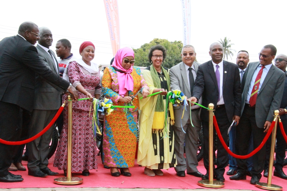 Makamu wa Rais Mhe. Samia Suluhu Hassan akikata utepe kwa ajili kukabidhi pikipiki wakati zoezi la ugawaji wa pikipiki kwa waataalam wa Maendeleo ya Jamii leo Jijini Dodoma wa kwanza kulia ni Mkuu wa Mkoa wa Dodoma Dkt. Binith Mahenge, wa pili kutoka kulia ni Waziri wa Afya Bi Ummy Mwalimu na kushoto kwake ni Mkurugenzi Mkazi wa Shirika la UN Women Bi. Ahodan Addou na viongozi wengine.