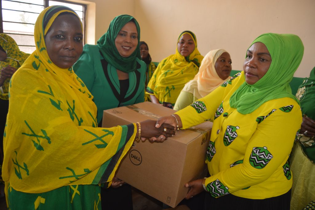 NAIBU Katibu Mkuu wa UWT Zanzibar Ndugu Tunu Juma Kondo(kulia),akimkabidhi Komputa Moja Katibu wa UWT Wilaya ya Dimani Ndugu Sunna Said Mzee(wa kwanza kushoto),Komputa hiyo imetolewa na Mbunge wa Viti Maalum Mkoa wa Magharib kupitia Baraza la Wawakilishi Mhe.Amina Idd Mabrouk(wa pili kushoto).