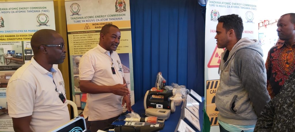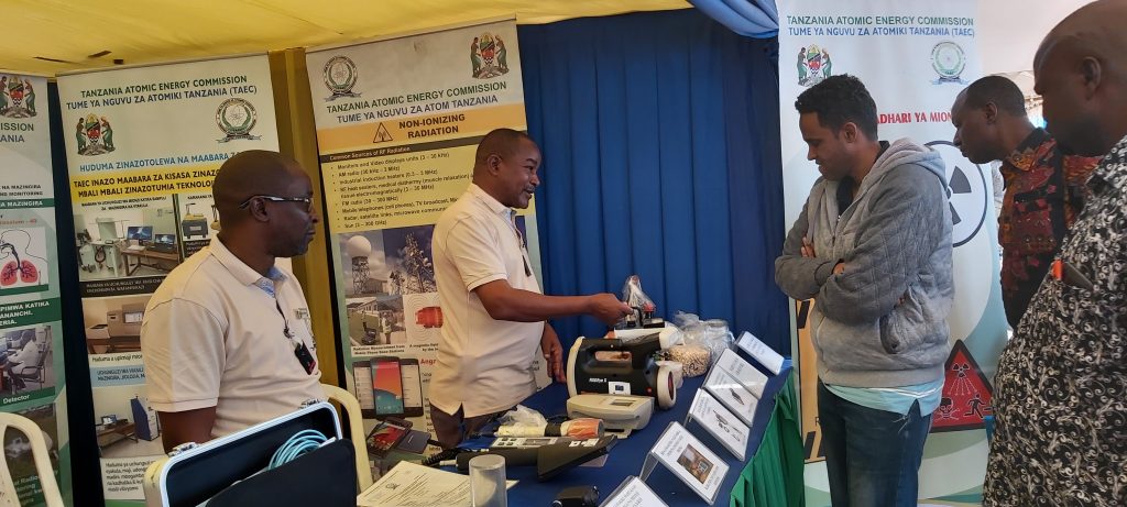 Naibu wa Waziri wa Kilimo ,Mhe Husein Bashe akipata maelezo toka kwa ofisa mwandamizi wa Utafiti vifaa vya Mionzi wa Tume ya Nguvu za Atomiki Tanzania Bwana Yesaya Sungita mara alipotembelea kwenye maonesho ya Nane nane yanayofanyika kwenye uwanja wa Nyakabindi Wilayani Bariadi ,mkoani Simiyu ambapo pamoja na mambo mengine , Mh Bashe amehoji ushirikiano wa TAEC na Wakala wa Taifa wa Hifadhi ya Chakula (NFRA) na kupata majibu kuwa ushurikiano upo kwa Taasisi hizo upo.