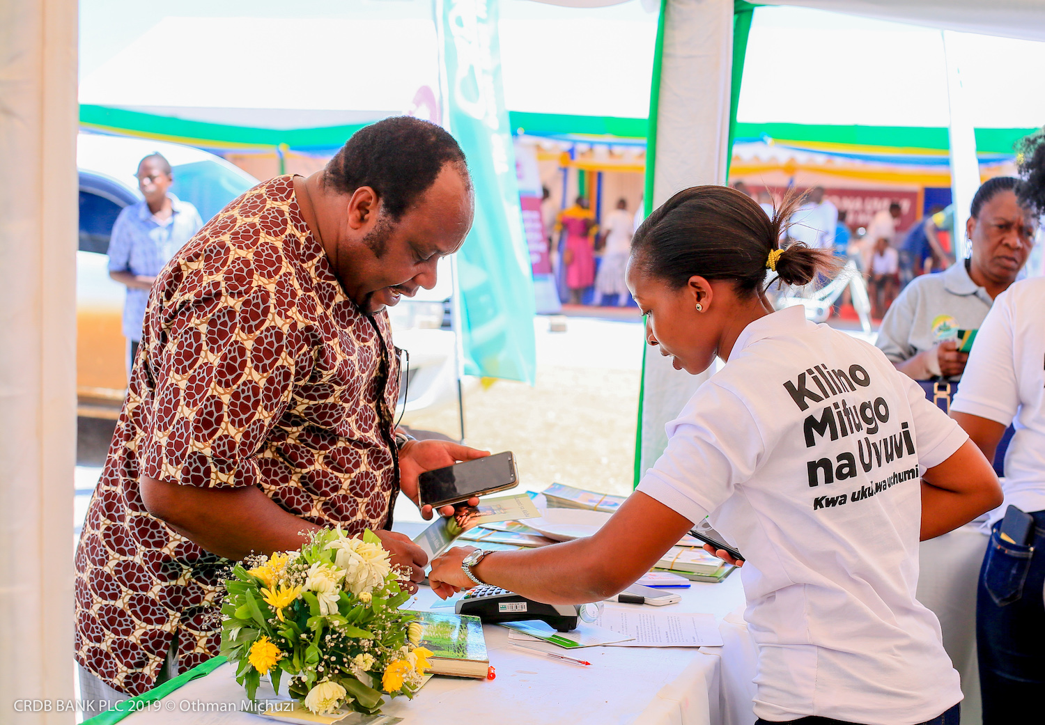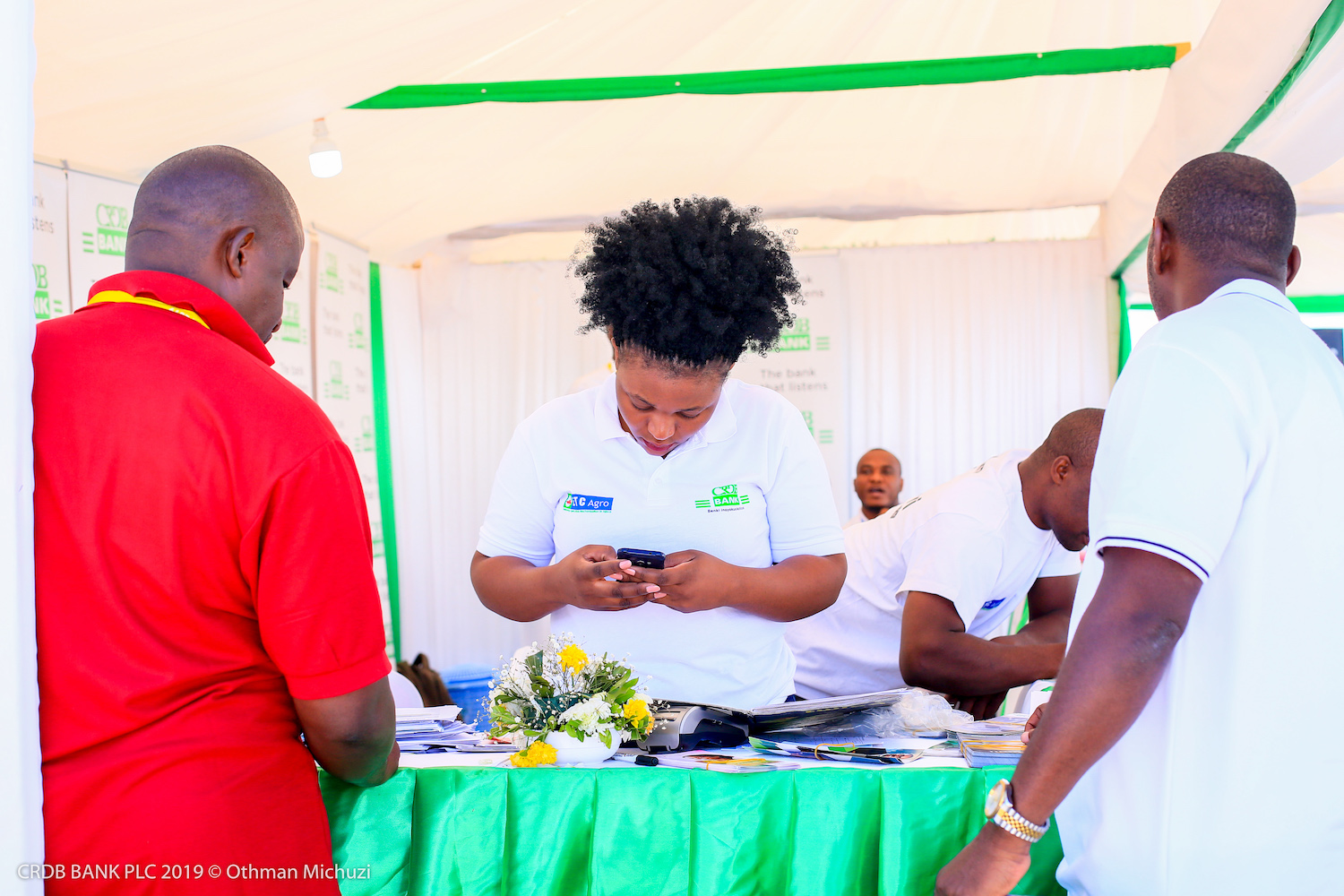 Afisa wa Benki ya CRDB, Mary Makunda akimuunganisha mteja na huduma ya SimBanking katika banda la Benki hiyo wakati wa maonyesho ya 26 ya Kilimo, Mifugo na Uvuvi (Nane Nane 2019), yanayofanyika kwenye viwanja vya Nyakabindi, Bariadi Mkoani Simiyu.