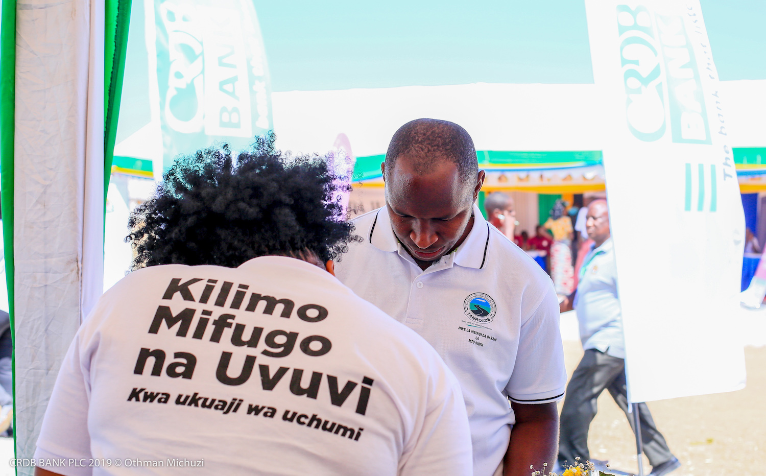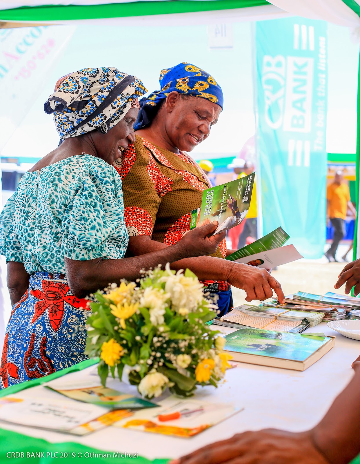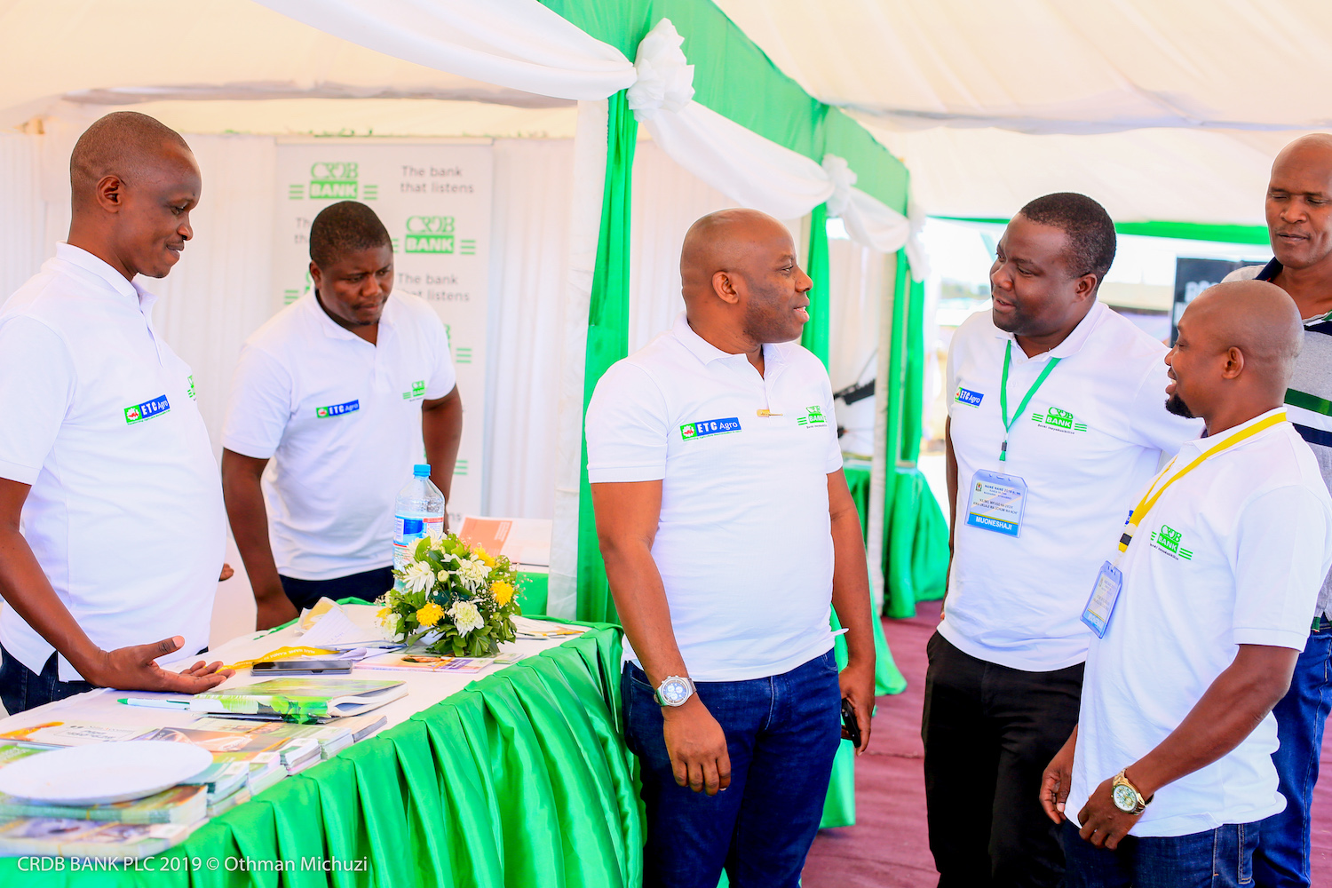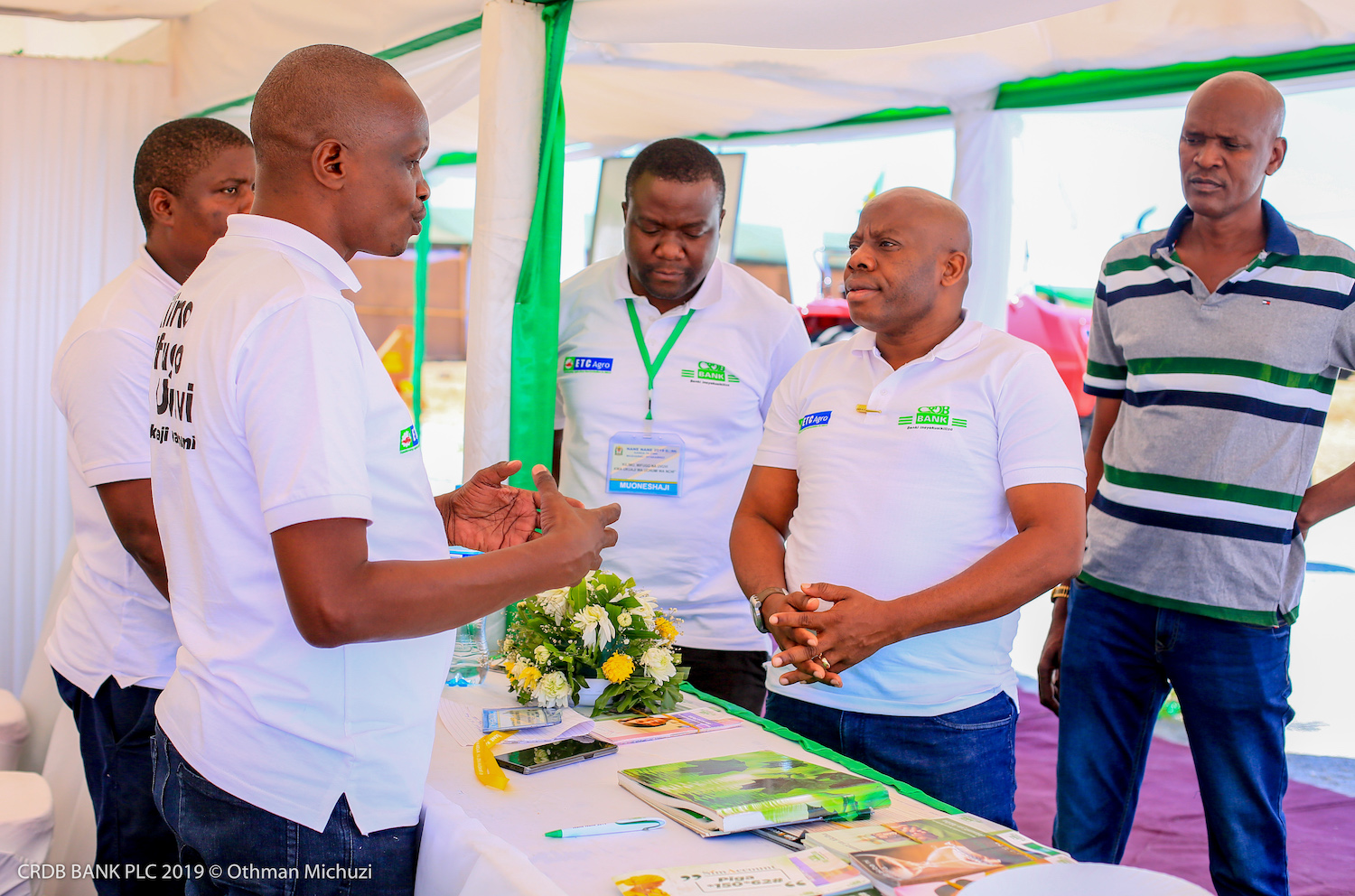 Mwenyekiti wa Chama cha Ushirika cha Mkoa wa Simiyu, Charles Madata akipokea maelekeo ya namna wakulima wanavyonufaika na mikopo ya pembejeo kutoka kwa Afisa wa Benki ya CRDB Dennis Dodo alipotembelea banda la Benki hiyo wakati wa maonyesho ya 26 ya Kilimo, Mifugo na Uvuvi (Nane Nane 2019), yanayofanyika kwenye viwanja vya Nyakabindi, Bariadi Mkoani Simiyu.