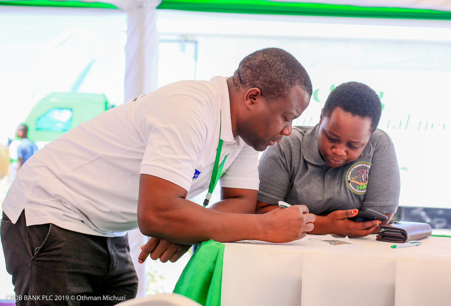Meneja Biashara wa Benki ya CRDB Tawi la Bariadi, Felix Kisenha akimfungua akaunti ya Mtoto (Junior Jumbo) mmoja wa wateja waliotembelea banda la Benki hiyo wakati wa maonyesho ya 26 ya Kilimo, Mifugo na Uvuvi (Nane Nane 2019), yanayofanyika kwenye viwanja vya Nyakabindi, Bariadi Mkoani Simiyu.