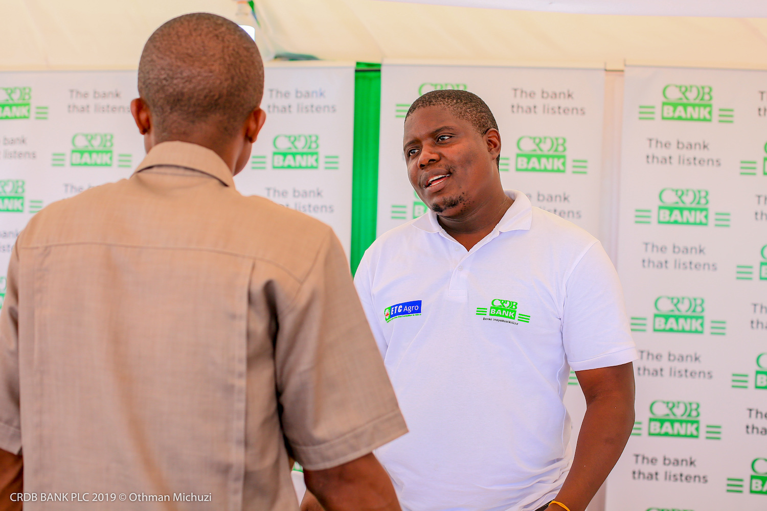 Afisa wa Benki ya CRDB, Daniel Nyamuvugwa akimsikiliza mmoja wa wateja waliotembelea banda la Benki hiyo katika maonyesho ya 26 ya Kilimo, Mifugo na Uvuvi (Nane Nane 2019), yanayofanyika kwenye viwanja vya Nyakabindi, Bariadi Mkoani Simiyu.