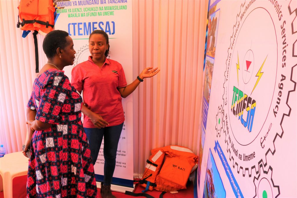 Mkuu wa kitengo cha Masoko na Uhusiano kutoka Wakala wa Ufundi na Umeme (TEMESA) Bi. Theresia Mwami kulia akimpa maelezo kuhusu huduma za Wakala huo Meneja wa Tanesco mkoa wa Simiyu Mhandisi Rehema Mashinji wakati alipotembelea banda la TEMESA katika maonesho ya wakulima Nanenane yanayoendelea katika viwanja vya Nyakabindi Wilayani Bariadi Mkoani Simiyu.