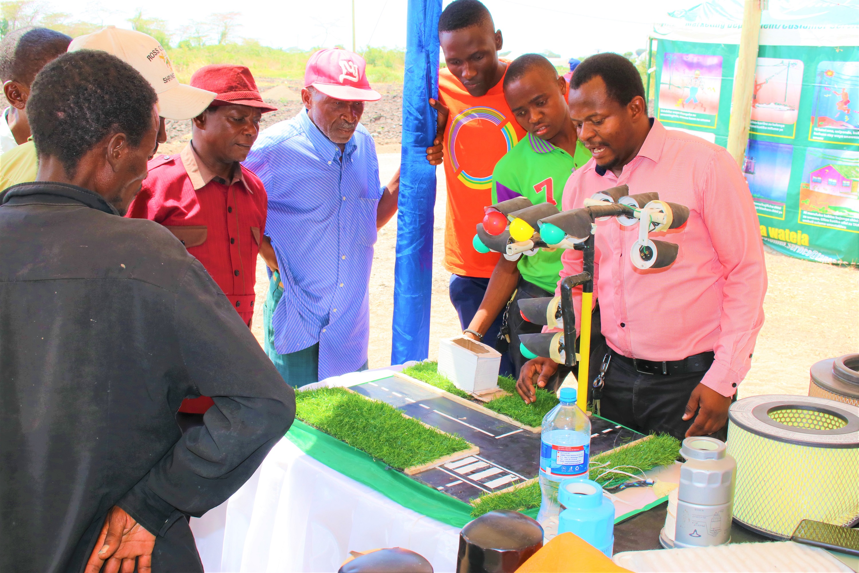 Mohamed Mohamed kulia, dereva kutoka Wakala wa Ufundi na Umeme (TEMESA) akiwapa elimu kuhusu matumizi ya taa za barabara na alama zake baadhi ya washiriki wa Maonesho ya Wakulima Nanenane waliotembelea banda la TEMESA katika viwanja vya Nyakabindi Wilayani Bariadi Mkoani Simiyu.
