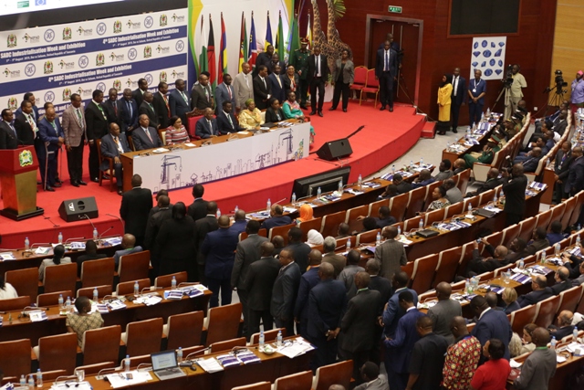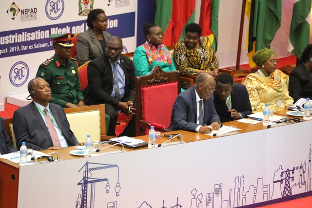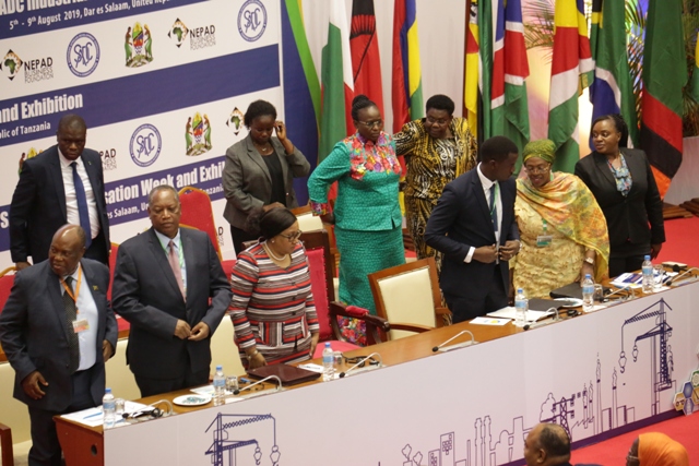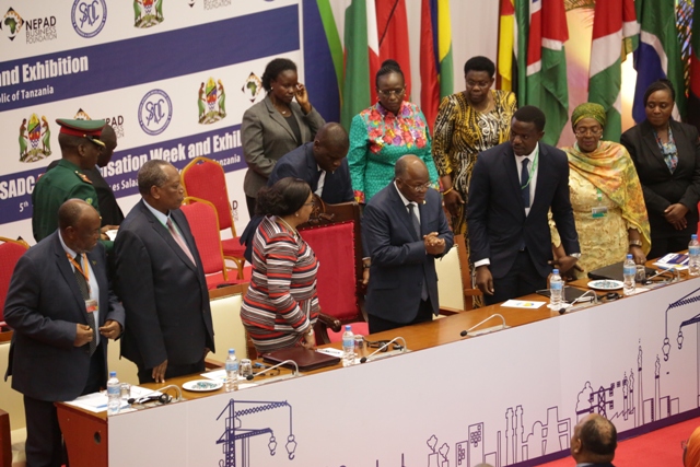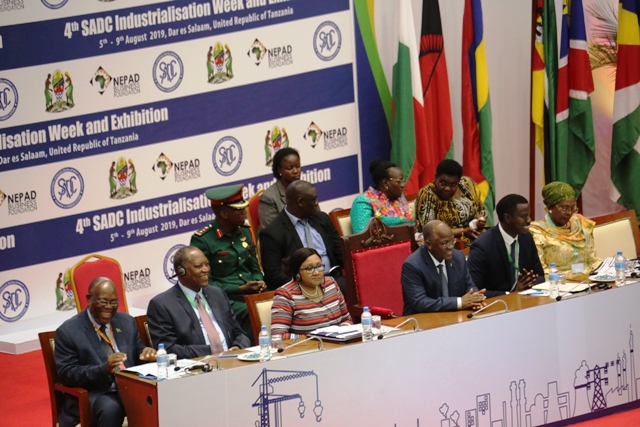 Baadhi ya mawaziri wa Jamhuri ya Muungano wa Tanzania na Serikali ya Mapinduzi ya Zanzibar pamoja na viongozi wa Jumuiya ya Kiuchumi ya nchi za kusini mwa Afrika SADC wakiwa kwenye ufunguzi wa maonyesho ya nne ya Wiki ya Viwanda kwa nchi za SADC yanayofanyika jijini Dar es Salaam.
