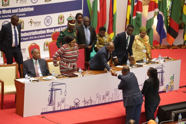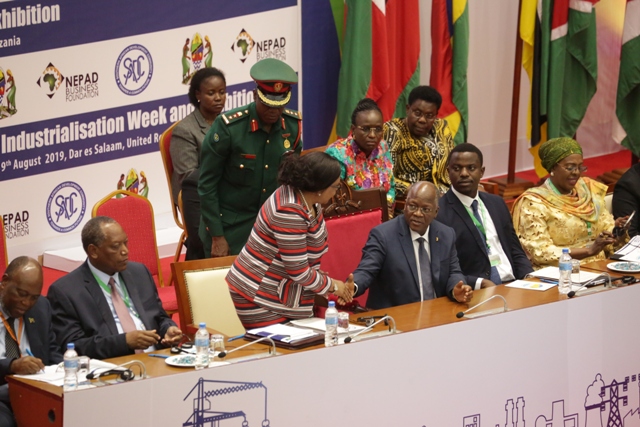 Rais wa Jamhuri ya Muungano wa Tanzania, Dkt John Pombe Magufuli akiwapongeza wajumbe katika ufunguzi wa maonyesho ya nne ya Wiki ya Viwanda kwa nchi za SADC yanayofanyika jijini Dar es Salaam leo Jumatatu Agosti 5, 2019.