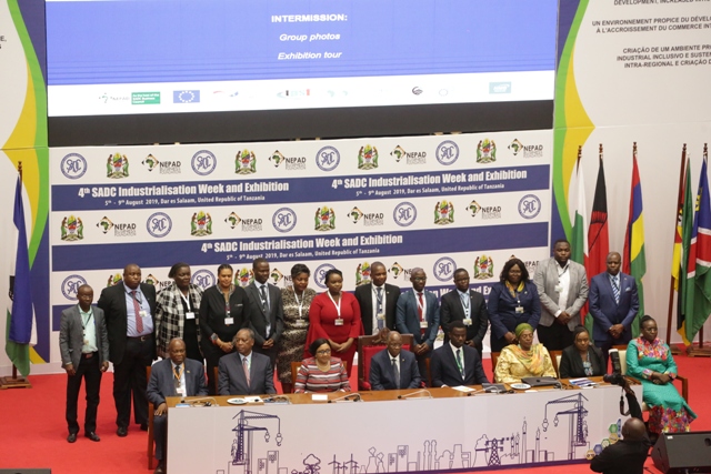 Rais wa Jamhuri ya Muungano wa Tanzania, Dkt John Pombe Magufuli akiwa katika picha ya pamoja na viongozi mbalimbali wa SADC na Jamhuri ya Muungano ya Tanzania mara baada ya kufungua maonyesho ya nne ya Wiki ya Viwanda kwa nchi za SADC yanayofanyika jijini Dar es Salaam leo Jumatatu Agosti 5, 2019.