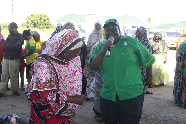 KATIBU Mwenezi wa CCM wilaya ya Tanga Lupakisyo Kapange kulia akicheza na wananchi wa Masiwani wakati wa ziara hiyo
