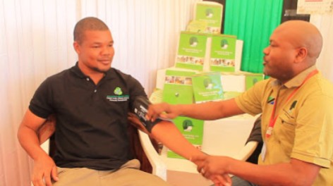 Mmoja wa wafanyakazi kutoka kampuni ya Osha akijaribu kumpima presha mmoja wa wateja walioweza kutembelea banda hilo katika Maonesho ya Nane Nane Mkoani Ruvuma
