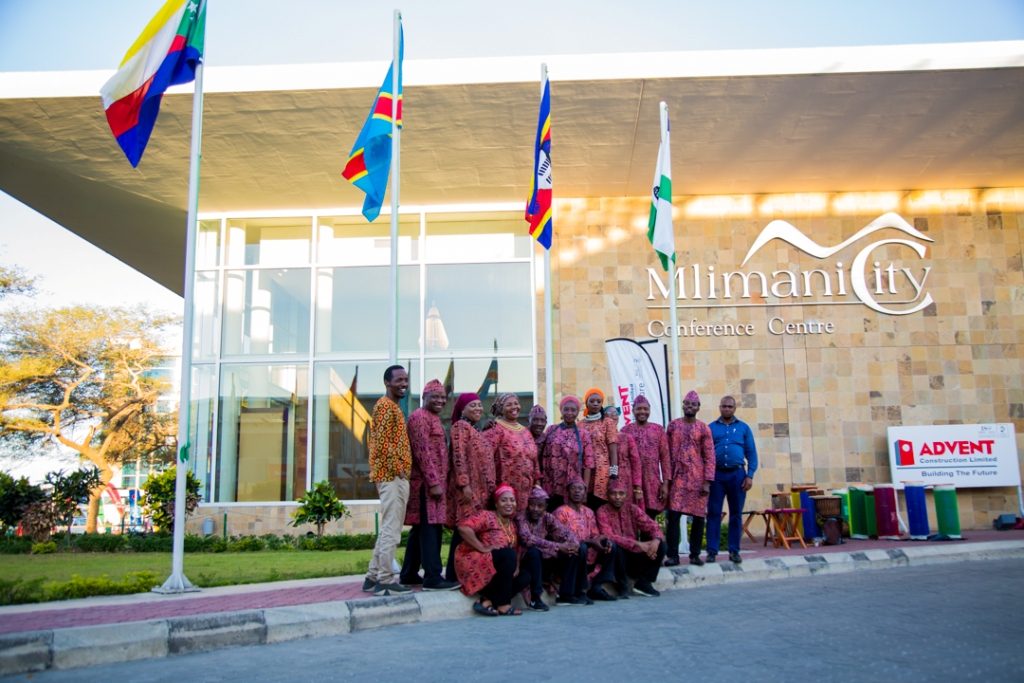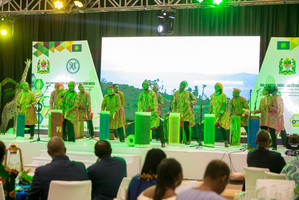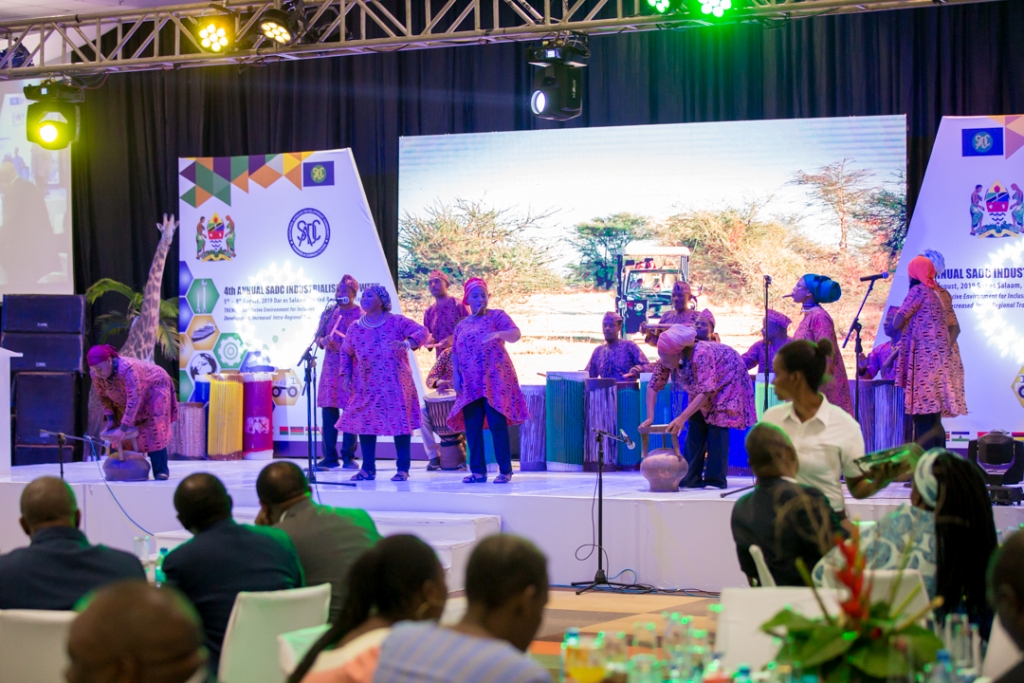Kikundi cha ngoma kutoka Taasisi ya Sanaa na Utamaduni Bagamoyo (TaSUBa) kikiwa katika picha ya pamoja kabla ya kuanza kutoa burudani kwa wageni mbalimbali walioalikwa katika chakula cha jioni. Hafla iliyoandaliwa kwa ajili ya ukaribisho wa wageni wa Mkutano wa SADC hususan wa wale wa Wizara ya Viawanda na Biashara.