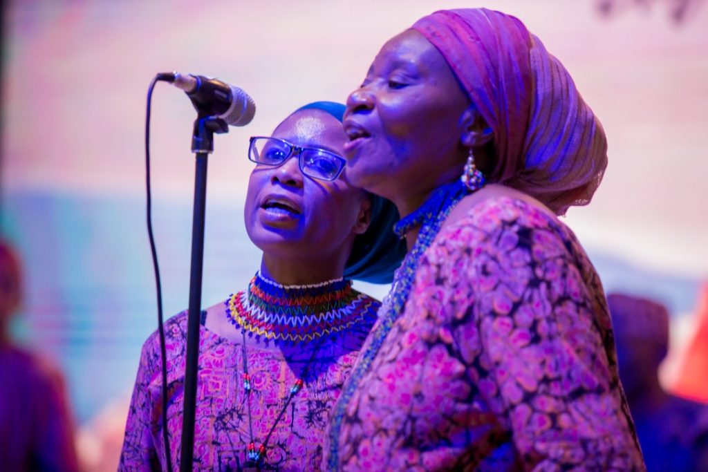 Waimbaji wa Kikundi cha ngoma kutoka Taasisi ya Sanaa na Utamaduni Bagamoyo (TaSUBa) wakiimba kwa kupokezana katika ngoma ya Nsimba ambayo inabebwa na uimbaji wa majibishano.
