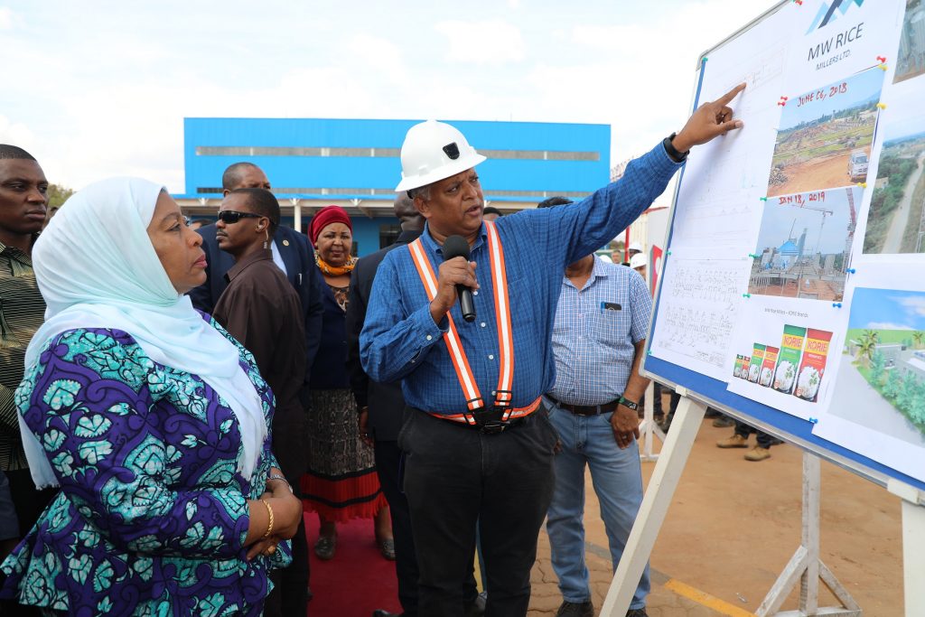 Makamu wa Rais wa Jamhuri ya Muungano wa Tanzania Mhe. Samia Suluhu Hassan, akipata maelezo kutoka kwa Meneja Ufundi wa Kiwanda cha kuchakata Mpunga na kuzalisha Mchele cha Murza Wilmer East Africa Miller Ltd Mkoani Morogoro Bw. Vaidya Subramaniam wakati wa hafla ya Uwekaji Jiwe la Msingi wa Kiwanda hicho leo Agost 07,2019. Makamu wa Rais yupo Mkoani Morogoro kwa Ziara ya kikazi ya siku Tatu. (Picha na Ofisi ya Makamu wa Rais).