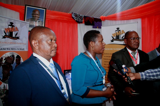 Bw. Peter Chuwa Meneja wa Wakala wa Vipimo (WMA) Kitengo cha Bandari akizungumza na waandishi wa habari katika banda la taasisi hiyo katika maonesho ya 4 ya wiki ya Viwanda kwa nchi za SADC, Kulia ni Jared Mushi Meneja wa Viwango na Uhakiki Wakala wa Vipimo WMA na katikati ni Irene John Meneja Mawasiliano na Uhusiano kwa Umma Wakala wa Vipimo (WMA)