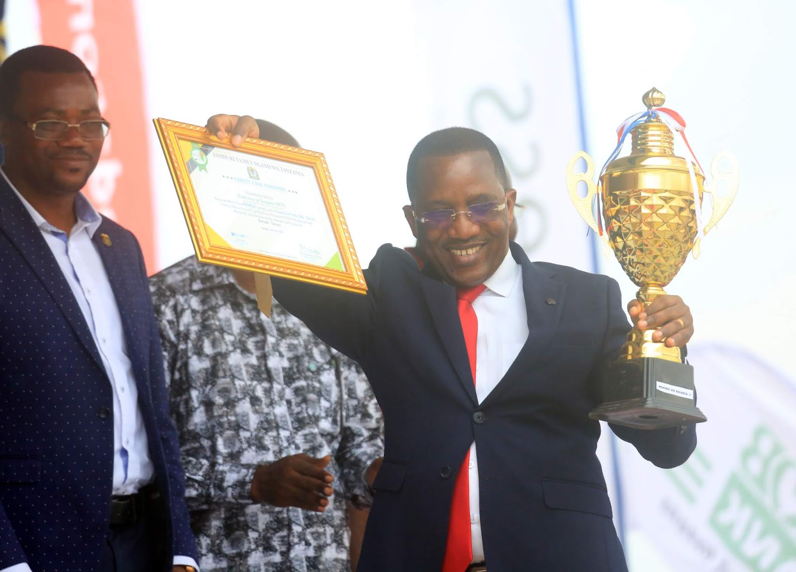 Mhe. Kassim Majaliwa, alimkabidhi vikombe vyote viwili na vyeti, Naibu Gavana wa BoT, Dkt. Bernard Kibesse, katika sherehe za kilele cha Nane Nane Agosti 8, 2019.