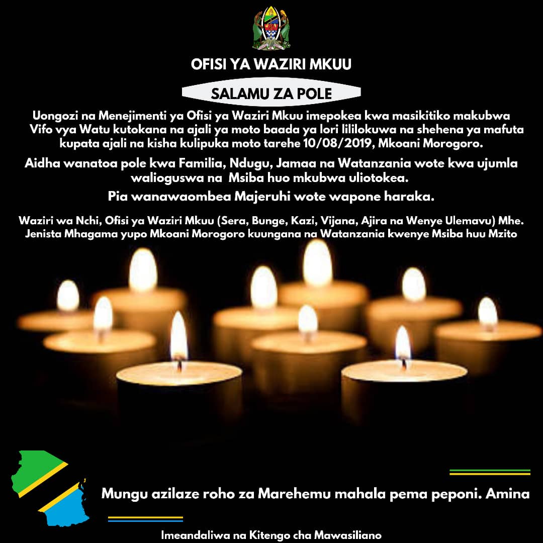 MchanganyikoOFISI YA WAZIRI MKUU YATOA SALAMU ZA RAMBIRAMBI AJALI YA LORI MOROGORO Last updated: 2019/08/10 at 7:25 PM Alex Sonna 6 years ago Share SHARE Alex Sonna August 10, 2019 August 10, 2019 Share this Article Facebook Twitter Email Print Previous Article MSD YAKABIDHI MADAWA MKOANI MOROGORO KWA AJILI YA MAJERUHI WA AJALI YA MOTO WA LORI LA MAFUTA Next Article SIMBA SC YAPATA SARE YA BILA KUFUNGANA UGENINI DHIDI YA UD SONGO YA MSUMBIJI LIGI YA MABINGWA