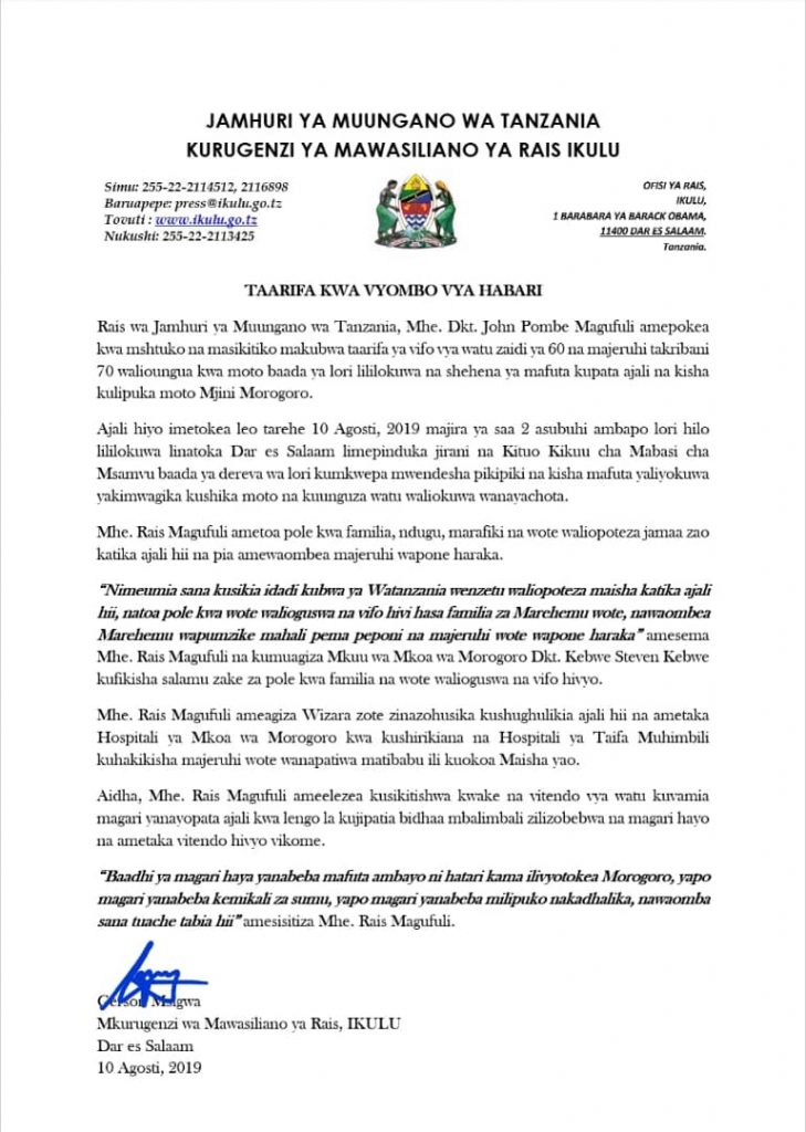 FeaturedMchanganyikoRAIS MAGUFULI ATOA SALAMU ZA RAMBIRAMBI AJALI YA LORI MOROGORO Last updated: 2019/08/10 at 2:49 PM Alex Sonna 6 years ago Share SHARE Alex Sonna August 10, 2019 August 10, 2019 Share this Article Facebook Twitter Email Print Previous Article DC KASESELA ATATUA MGOGORO WA ARDHI WA FAMILIA YA MZEE MWENDA Next Article WANAOKWENDA KINYUME NA BEI ELEKEZI YA SERIKALI WACHUKULIWE HATUA