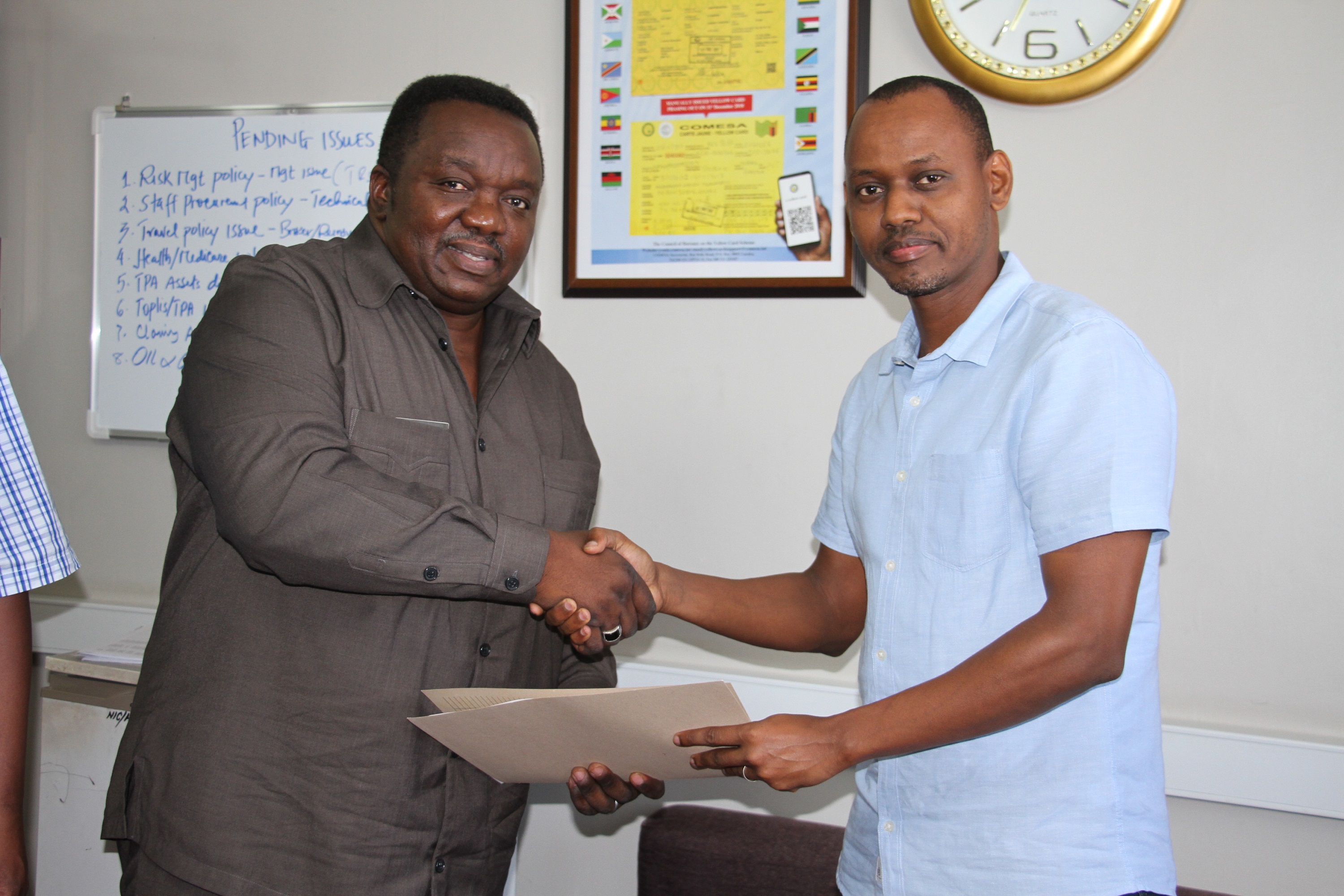 Mkurugenzi Mtendaji mpya wa Shirika la Bima la Taifa- NIC, Dkt. Elirehema Doniye (kulia), akikabidhiwa rasmi ofisi hiyo na aliyekuwa Mkurugenzi wa Shirika hilo, Bw. Sam Kamanga, jijini Dar es Salaam.